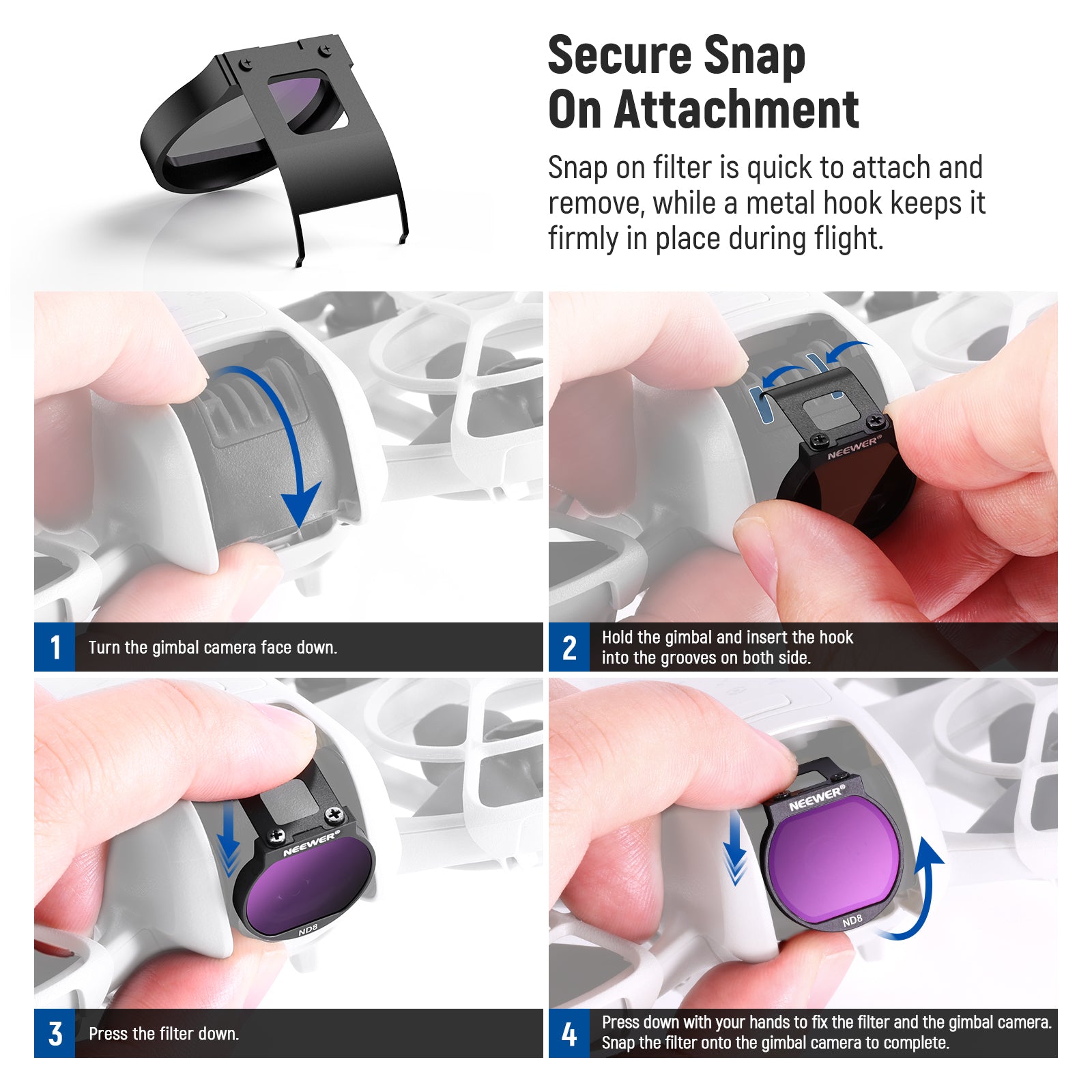 - Fixation sécurisée par clip – La conception à clip assure une fixation et un retrait rapides, tandis qu'un crochet maintient le filtre fermement en place pendant le vol. Le cadre métallique fin et léger prévient le vignettage et n'affecte pas l'utilisation du protecteur de nacelle.