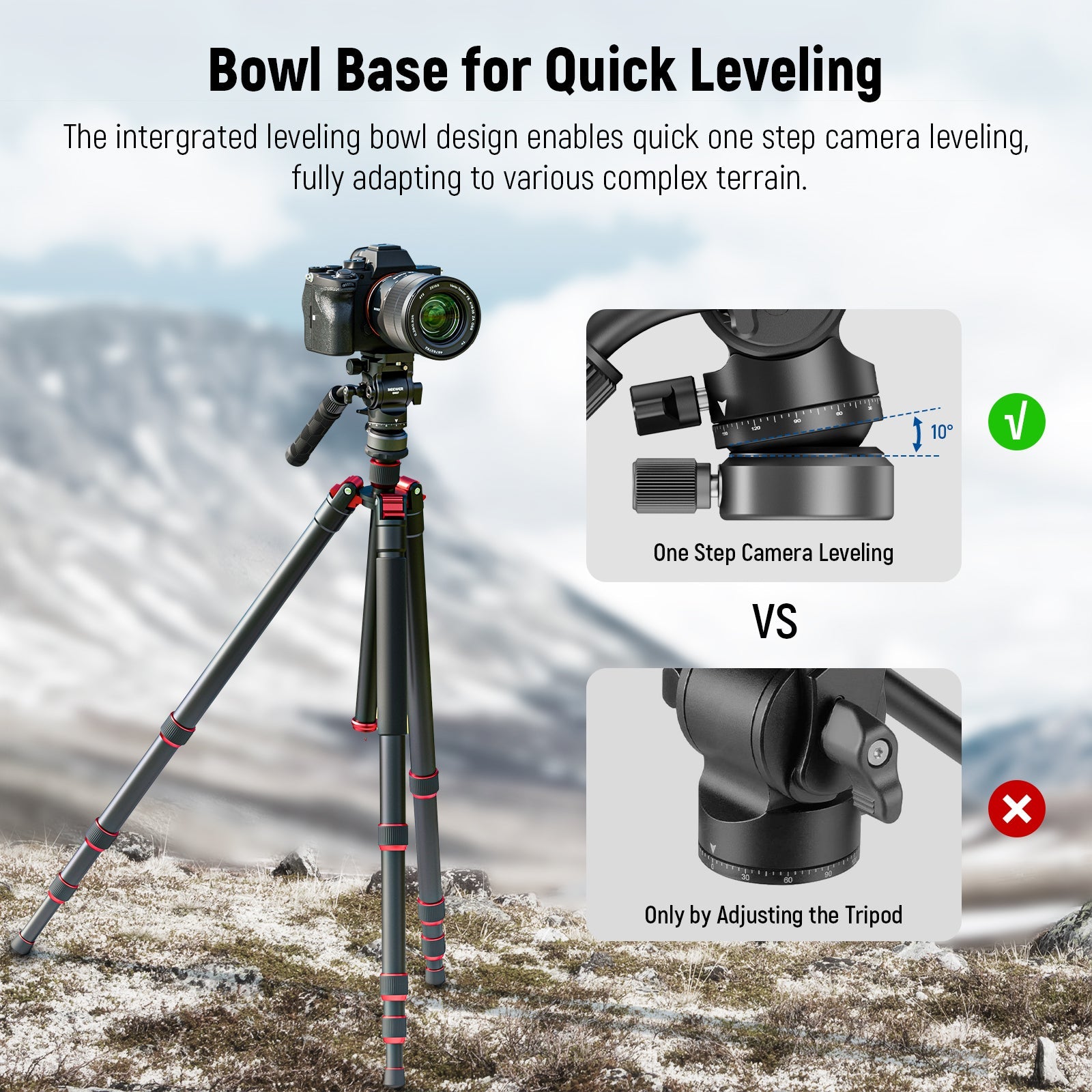 - Base à rotule pour une mise à niveau rapide : la rotule de mise à niveau intégrée permet un réglage précis de l’orientation de l’objectif en une seule étape, avec des angles de +10°/-10°, pour une mise à niveau rapide de votre appareil photo sur des terrains accidentés. Elle comprend également un niveau à bulle pour une vérification plus facile.