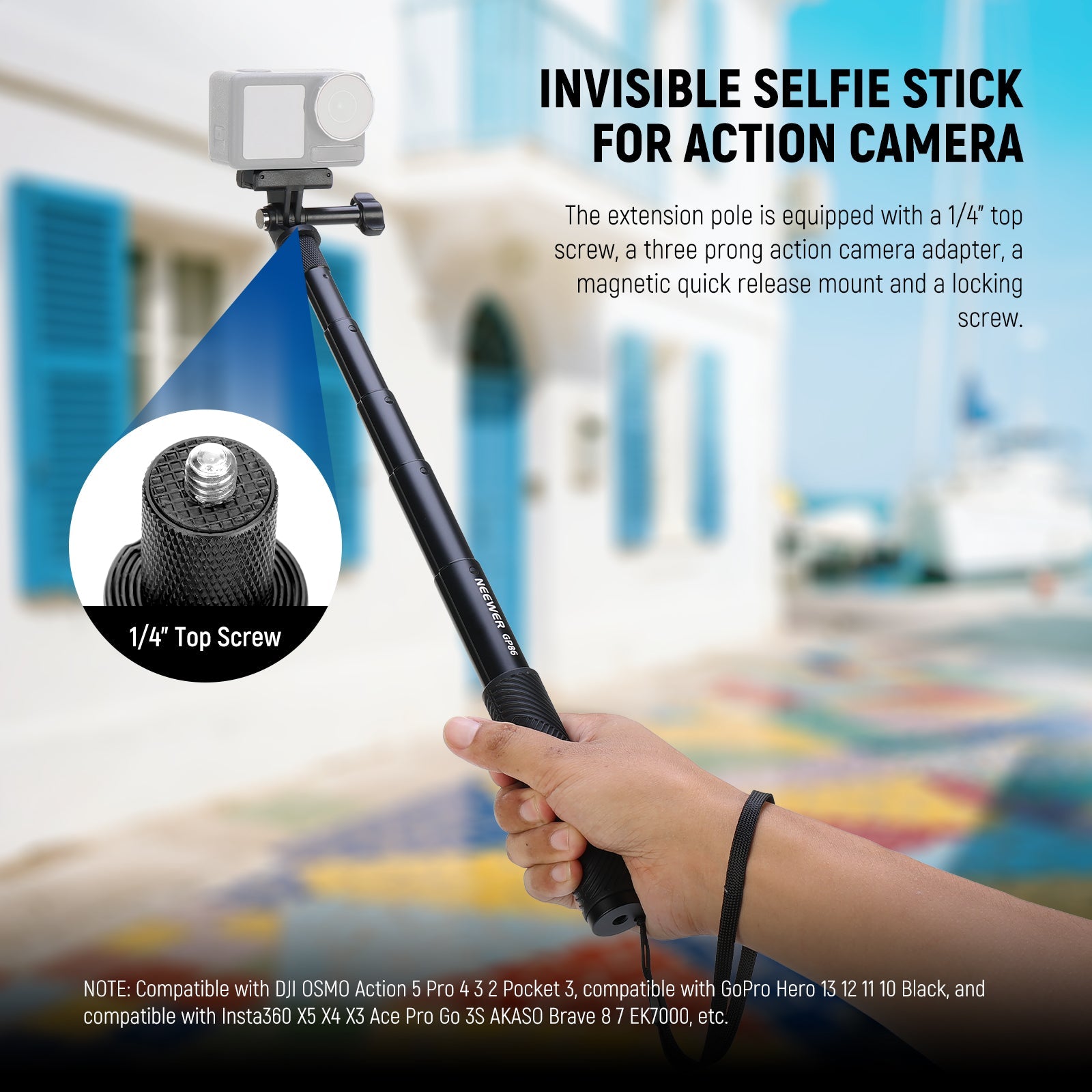 - Perche à selfie invisible pour caméra d'action - Ce support de perche portable est équipé d'une vis supérieure 1/4", d'un adaptateur à trois broches pour caméra d'action, d'une fixation magnétique à dégagement rapide et d'une vis de verrouillage. Il est compatible avec les DJI OSMO Action 5, Pro 4, 3, 2, Pocket 3 Creator Combo, les GoPro Hero 13, GoPro 12, 11 et 10 Black, ainsi que les Insta360 X5, X4, X3, Insta360 Ace Pro, Go3S, AKASO Brave 8, 7, EK7000, etc., et constitue un accessoire indispensable pour la photographie et la prise de vue en situation réelle.