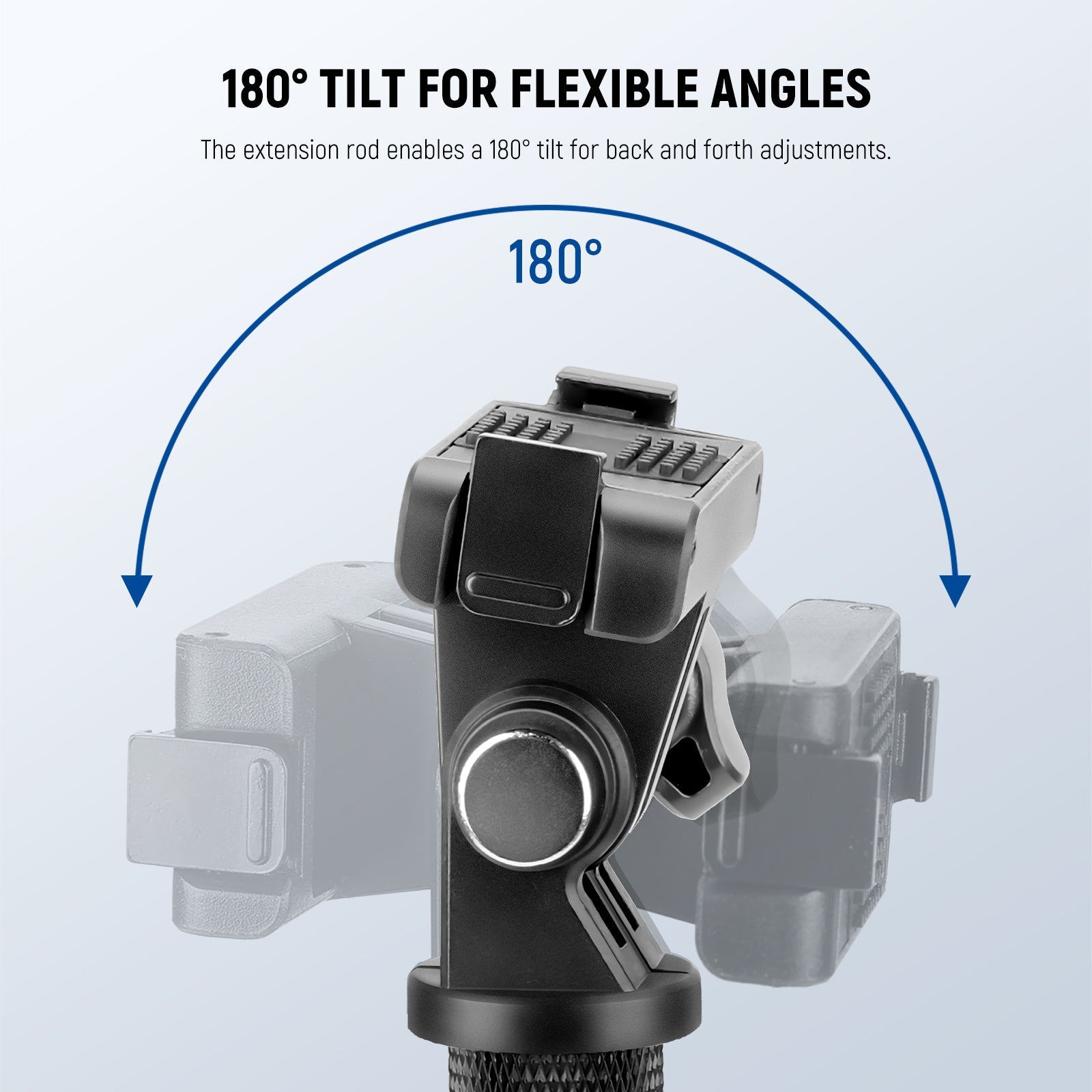 - Inclinaison à 180° pour des angles flexibles - La tige d'extension permet une inclinaison à 180° de votre caméra d'action, permettant des ajustements d'avant en arrière et vous faisant gagner du temps lors des prises de vue et des enregistrements vidéo.