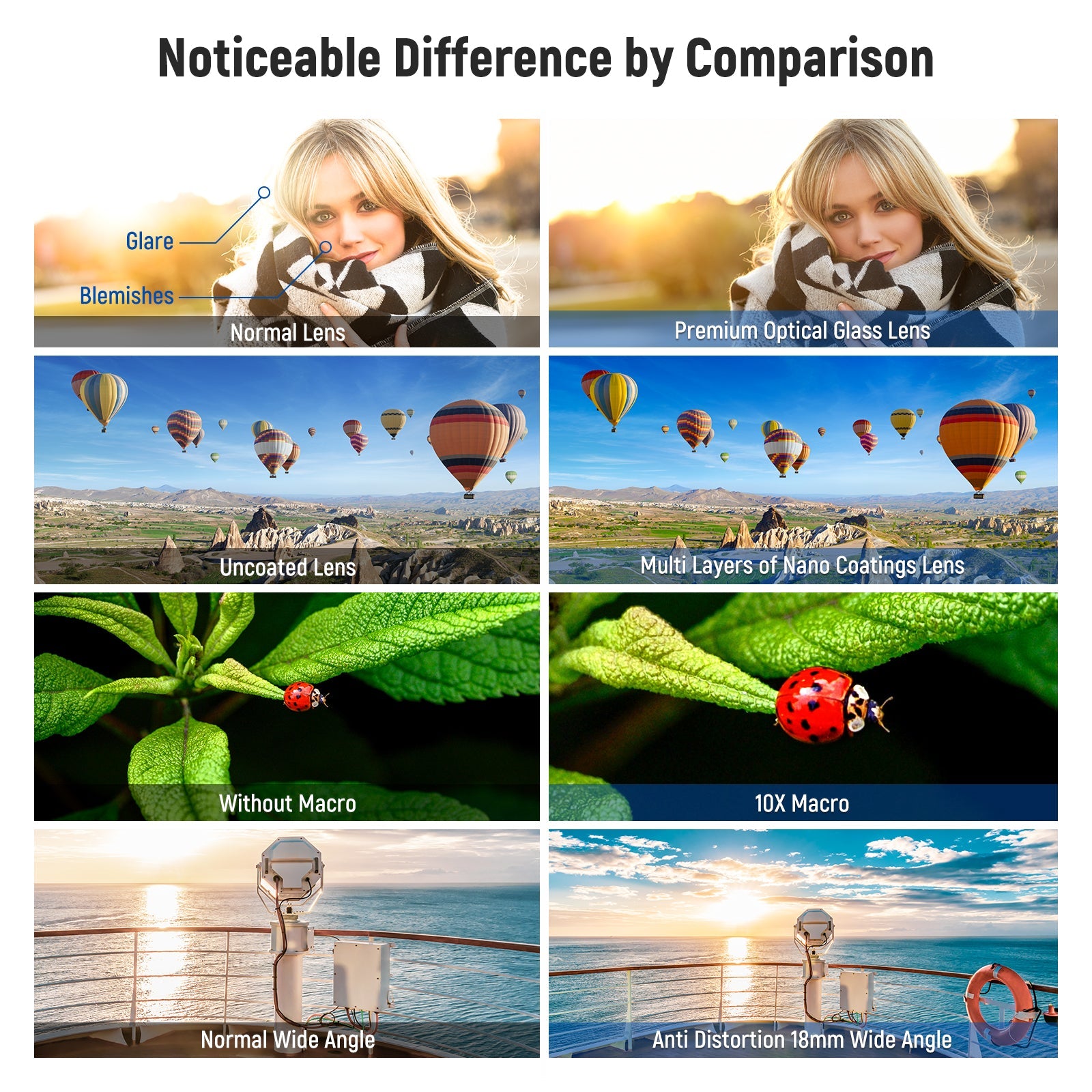 - Conception multicouche à deux éléments : Composée de deux groupes de verres correcteurs optiques HD à deux éléments, associés à plusieurs couches de nano-revêtements pour réduire les reflets et l’éblouissement, la lentille macro grand angle offre des images haute résolution aux couleurs naturelles. Aucune distorsion ni aberration chromatique.