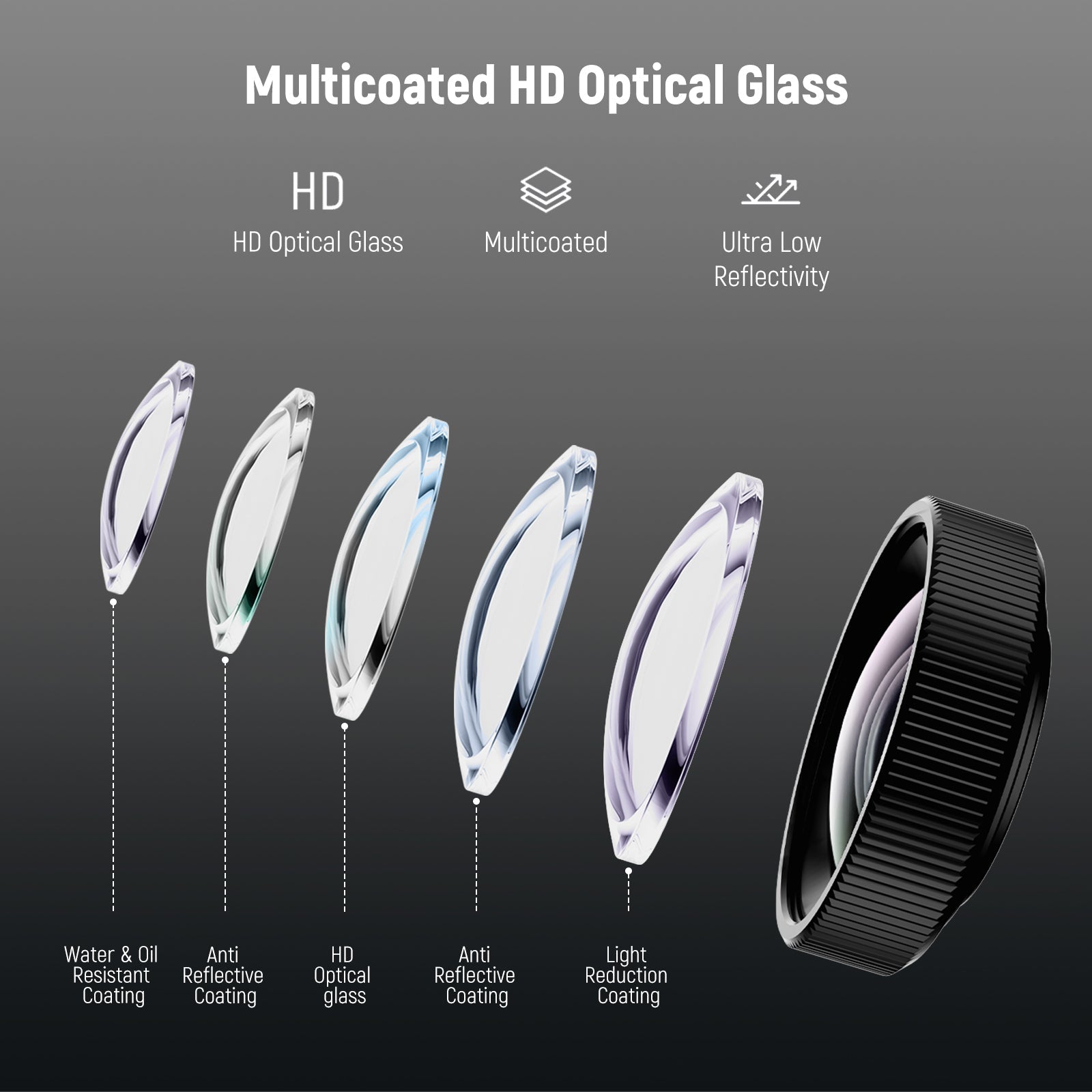 - Verre optique HD multicouches : ce verre optique HD à 2 éléments par groupe garantit une clarté exceptionnelle. Ses multiples traitements de surface à faible réflectance réduisent efficacement les reflets et les images fantômes, tout en résistant aux traces de doigts et aux taches.