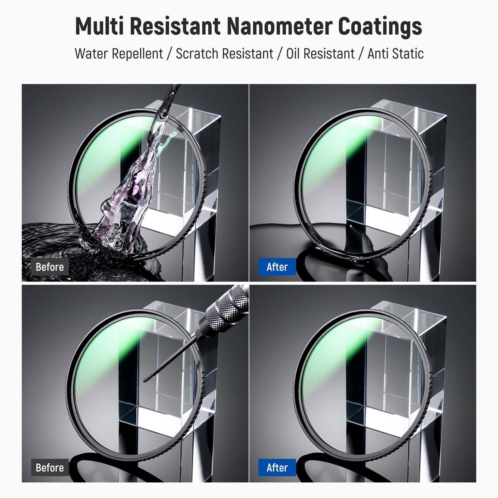 - Revêtements multiples double face - Fabriqué avec 24 couches de nano-revêtements sur les deux faces, ce filtre UV réduit les reflets et l'éblouissement. Il est également antistatique, résistant à l'huile, hydrofuge et résistant aux rayures.