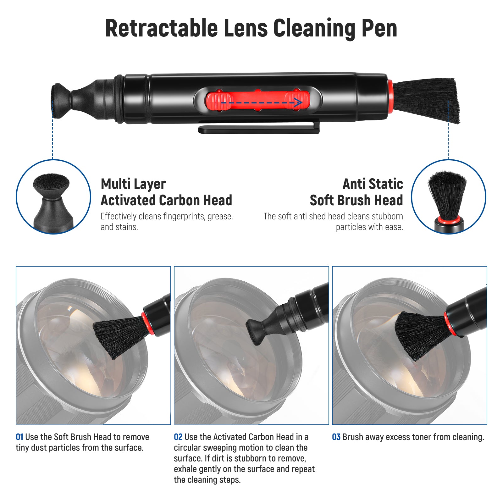 - Nettoyage quotidien simplifié : un stylo de nettoyage extensible et un chiffon de nettoyage vous permettent d’éliminer facilement la poussière, les débris, les empreintes digitales et les traces de doigts des filtres et des lentilles sans les rayer.