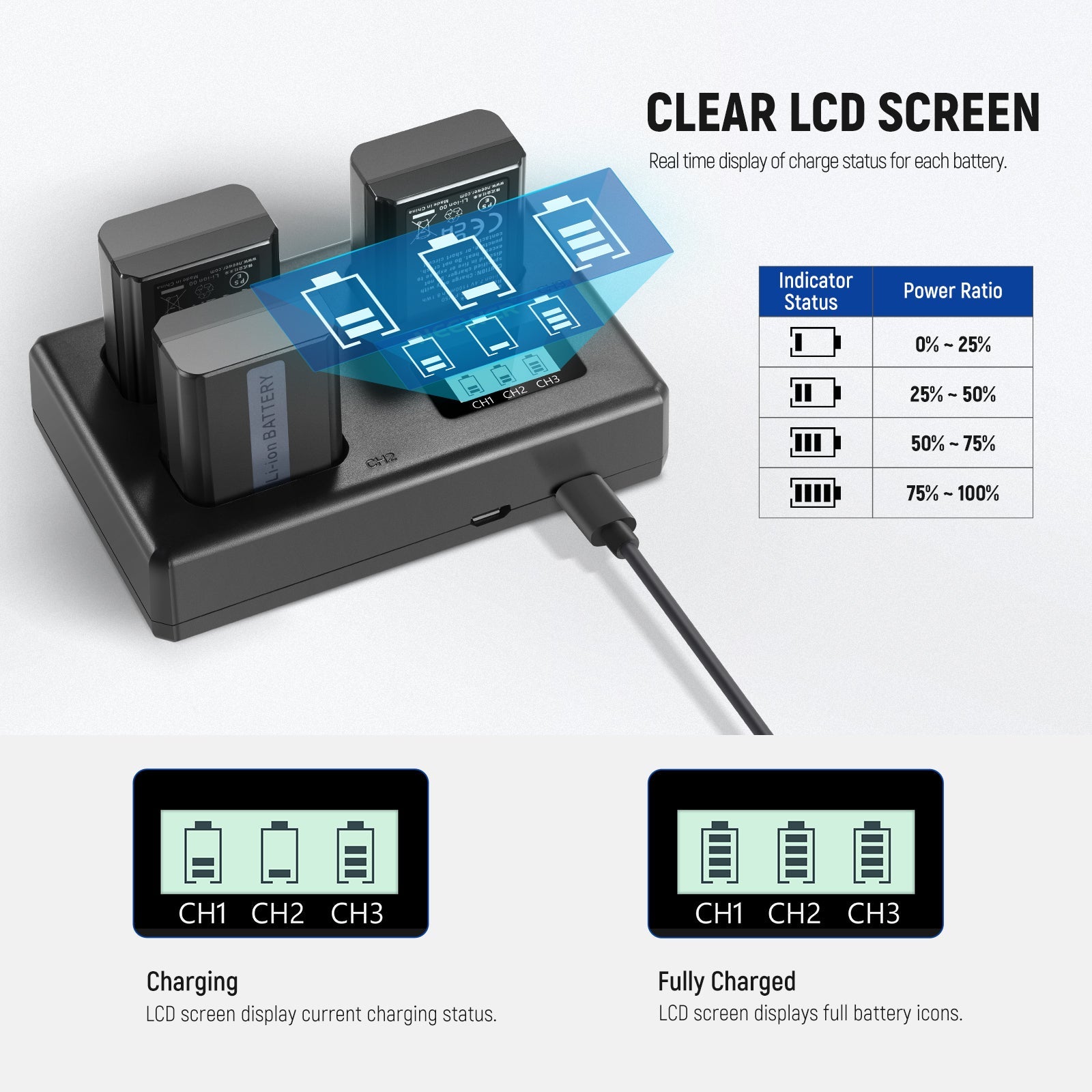 - Chargeur triple USB - Ce chargeur triple USB vous permet de charger simultanément 3 batteries à la maison, au bureau ou en déplacement. Un écran LCD rétroéclairé vous permet de visualiser l'état de charge de chaque batterie, même dans l'obscurité.