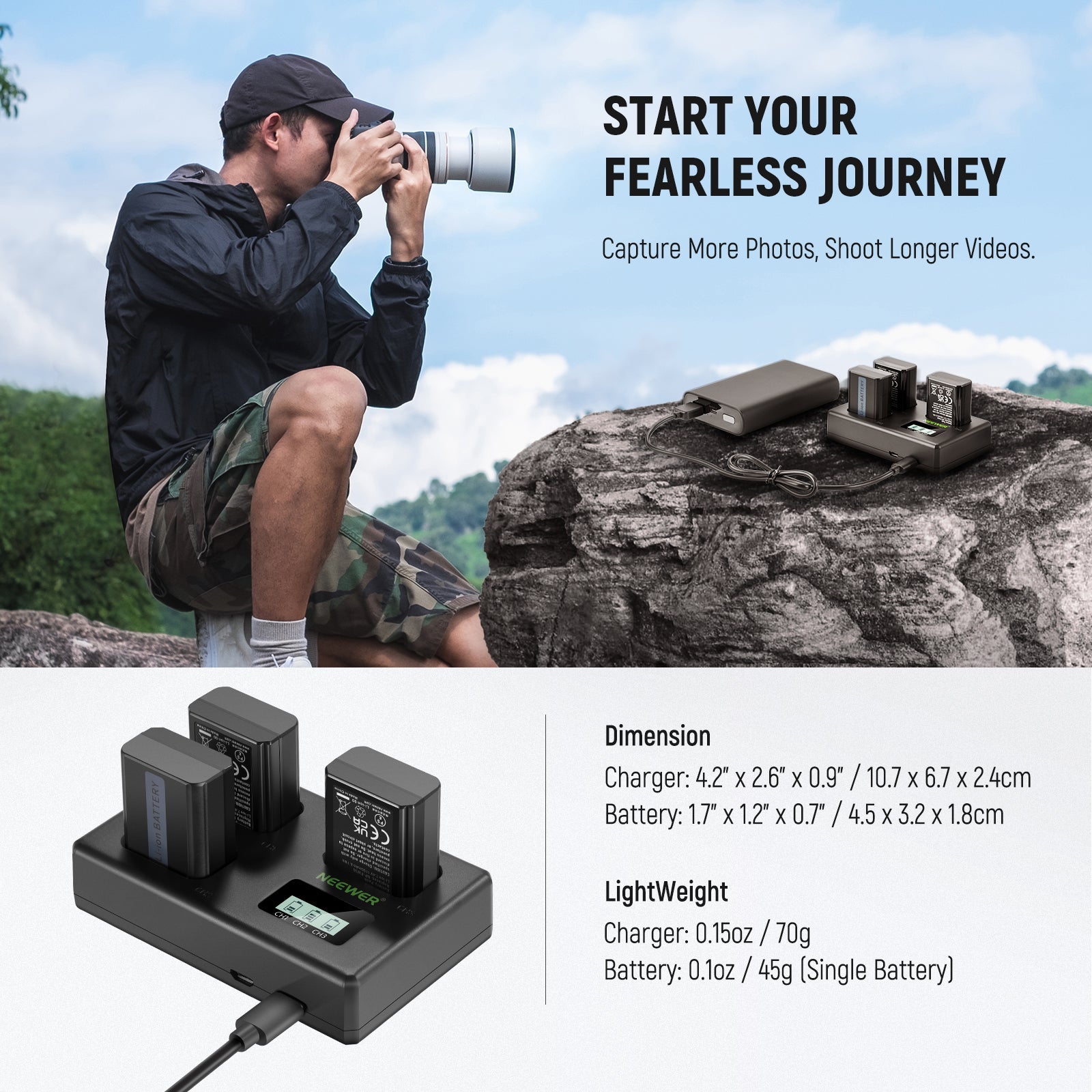 - Une autonomie suffisante pour votre appareil photo : trois batteries de rechange NP-FW50 de 1 100 mAh offrent une autonomie optimale aux photographes, vlogueurs et cinéastes travaillant en extérieur, leur permettant d’immortaliser chaque instant précieux.