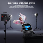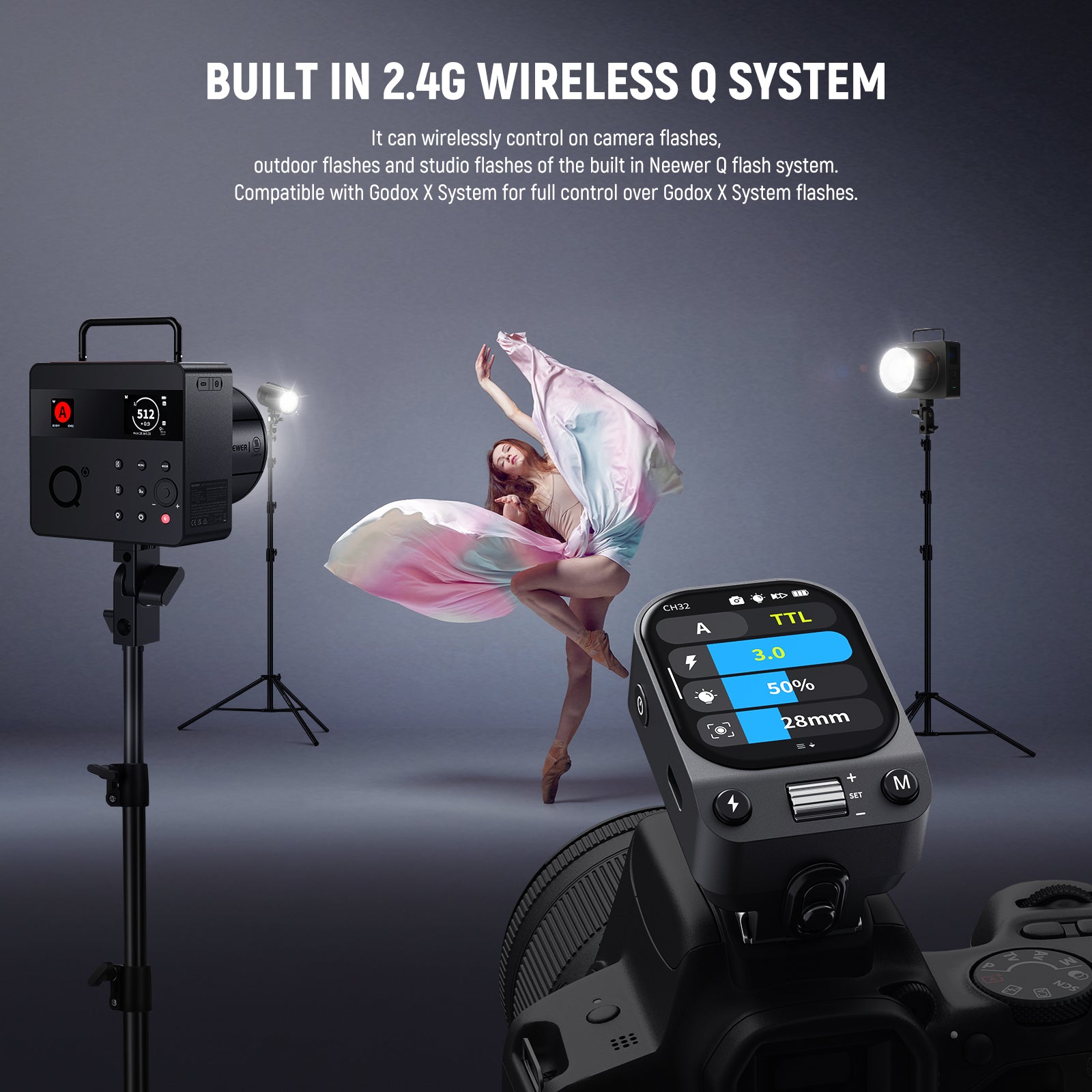 • Système sans fil Q 2,4 GHz intégré : déclenchez sans fil les flashs NEEWER NW420-C, Z1-C, Z2-C, Z760-C, Z880-C, NW760-C, Z2PRO-C, S102-400W Pro, NW655-C et QC (déclenchement hors caméra uniquement), ou contrôlez d’autres flashs sans système Q via un récepteur QR NEEWER et un câble de synchronisation 2,5 mm (vendus séparément). Fonction de balayage des canaux pour détecter les canaux libres et réduire les interférences entre les 5 groupes, 32 canaux et les identifiants 01 à 99 dans un rayon de 100 m.