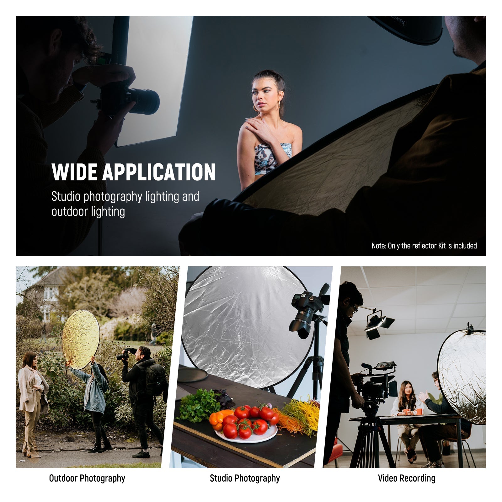 - Kit réflecteur photo polyvalent 7 en 1 - Ce kit RF-110A 7 en 1 comprend un panneau translucide pour la diffusion de la lumière et une housse réversible 6 faces (3 couches) offrant six effets de réflexion : or, argent, blanc, noir, vert et bleu. Personnalisez votre éclairage sans effort en combinant deux couches de tissu réfléchissant grâce à la fermeture éclair double face.