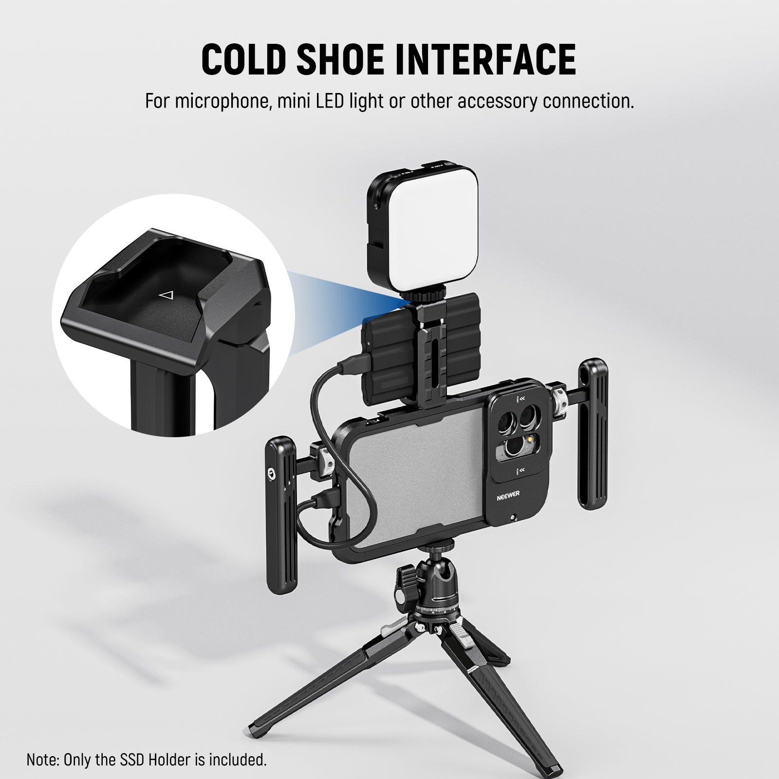 - Enregistrement vidéo direct pour iPhone 15 Pro/15 Pro Max : fixez ce support SSD à la griffe porte-accessoires des cages NEEWER PA023/PA024 pour iPhone 15 Pro/15 Pro Max afin d’enregistrer directement les vidéos 4K et ProRes enregistrées sur les modèles 15 Pro et 15 Pro Max sur les SSD T5/T7/T9. Profitez ainsi d’un espace de stockage généreux pour une créativité sans limites.