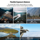 - Équilibre d'exposition flexible : les filtres variables ND2-32 et ND64-512 réduisent la lumière de 1 à 5 diaphragmes et de 6 à 9 diaphragmes respectivement, permettant un contrôle précis de l'exposition dans diverses conditions d'éclairage. Ils vous permettent de capturer rivières, cascades et traînées lumineuses avec un flou de mouvement dynamique, ajoutant une touche cinématographique à vos prises de vue aériennes par drone.