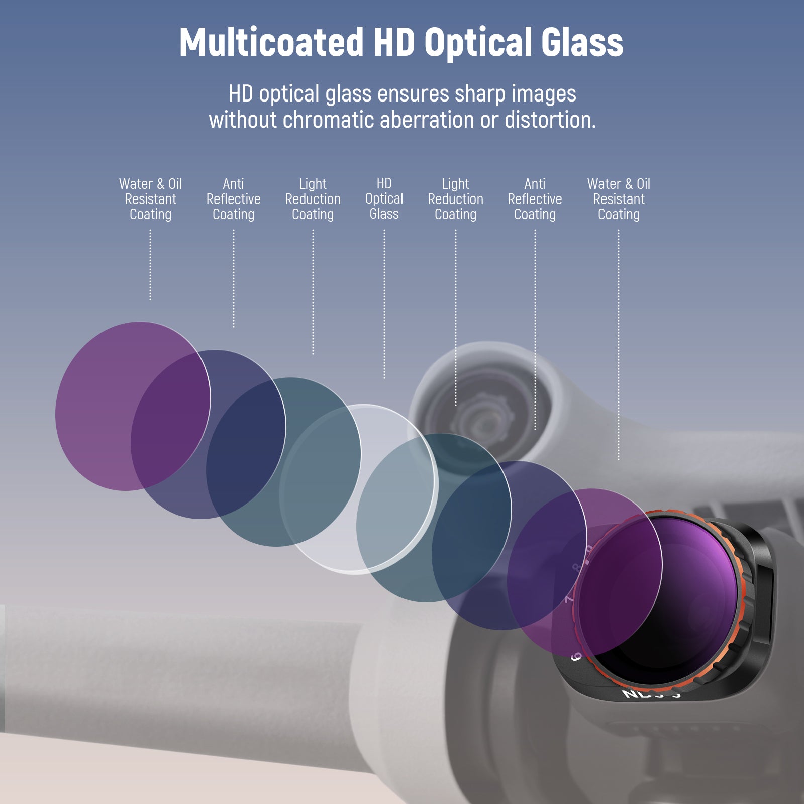 - Verre optique HD multicouches - Le verre optique HD garantit des images nettes, sans aberration chromatique ni distorsion. Ses multiples couches protectrices résistent à l'eau, à l'huile, à la poussière et aux rayures, pour un nettoyage facile.