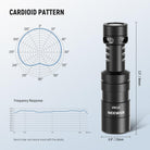 - Directivité supercardioïde claire : la directivité supercardioïde capte les sources sonores situées devant et derrière le microphone, idéale pour les interviews où il est nécessaire d'enregistrer la voix de deux personnes. Distance de captation optimale : 50 à 100 cm.