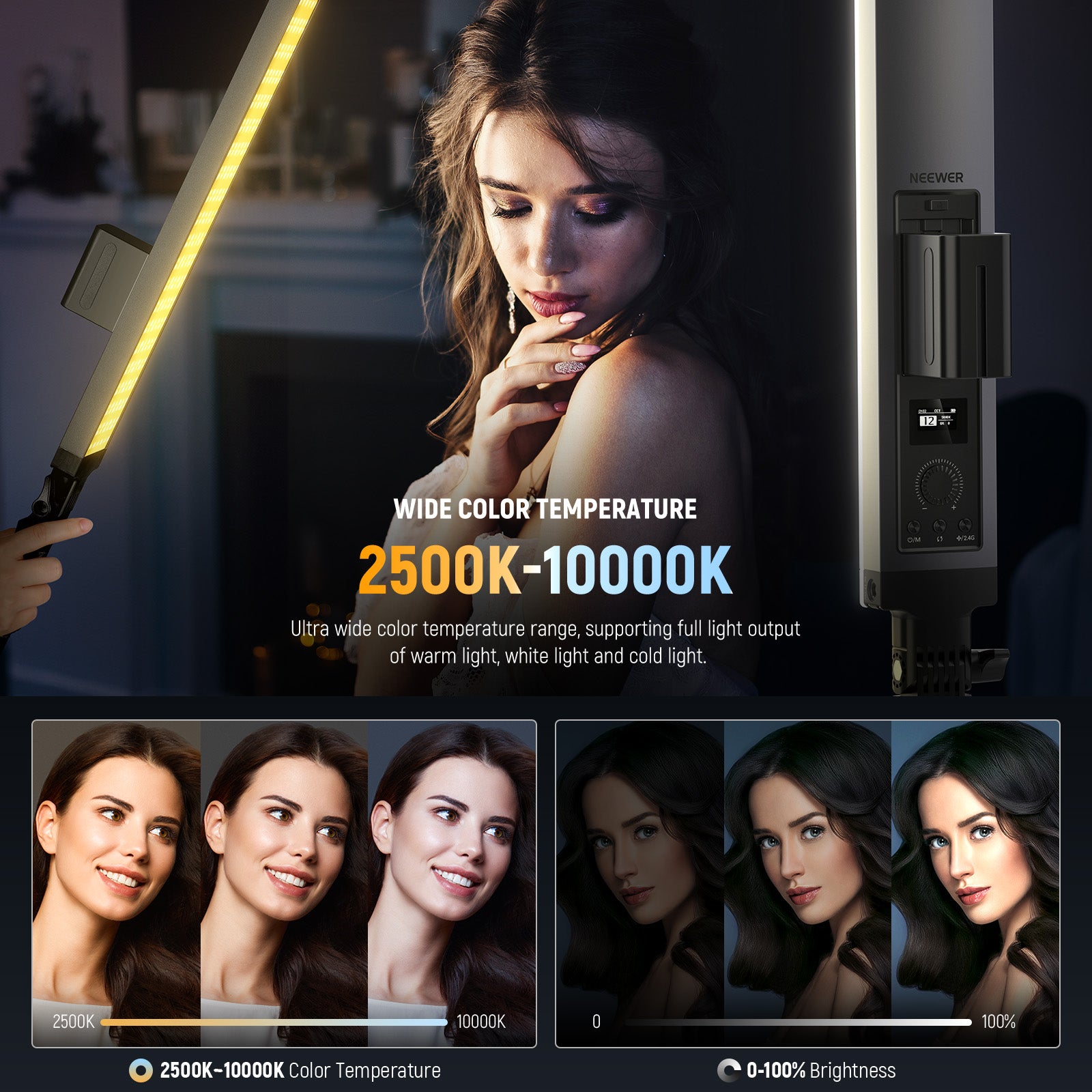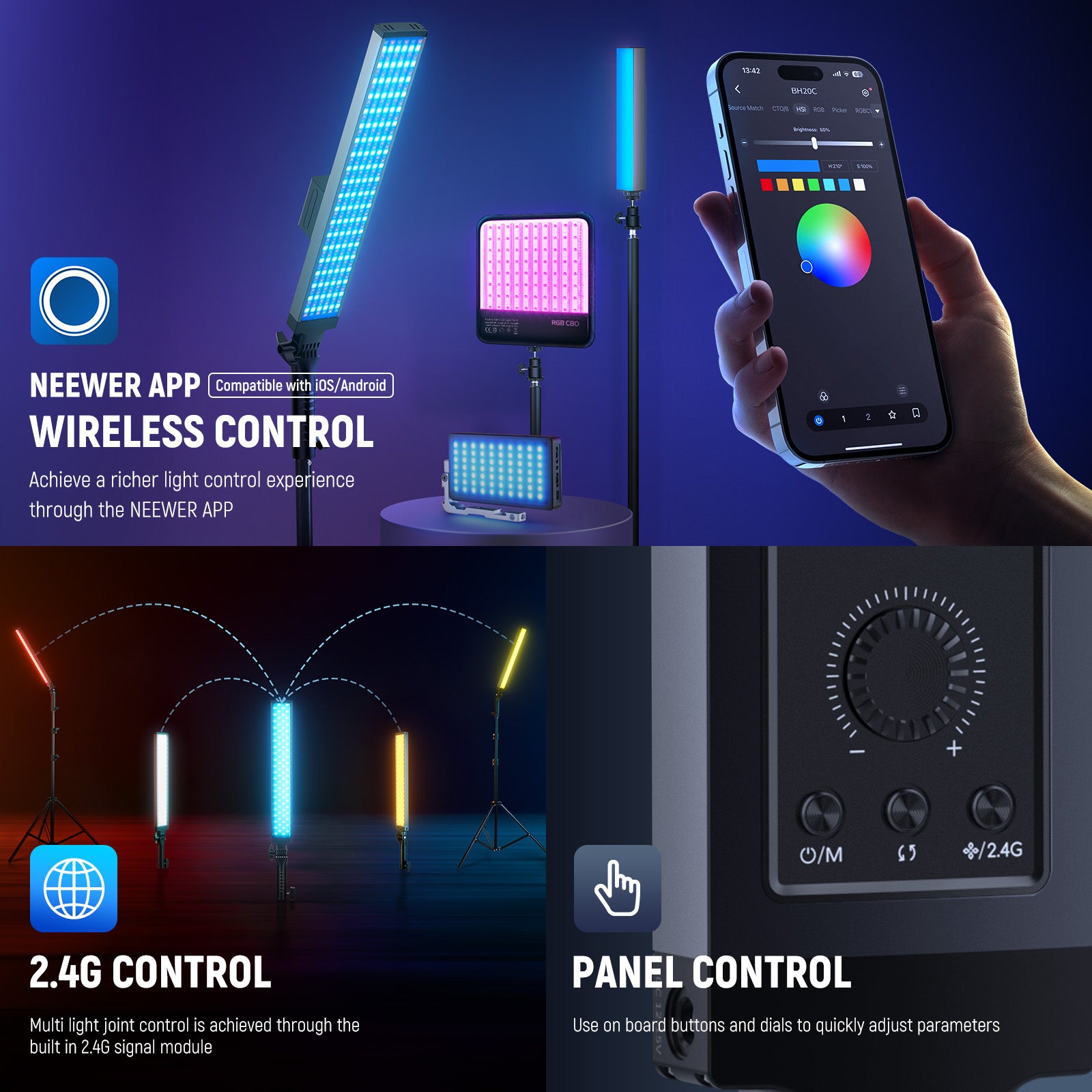 - APP/2.4G/Panel Control- Directly adjust the color temperature, brightness, GM value, etc, via the control panel; or download NEEWER APP and connect it to the light wands via Bluetooth to manage more functions; to explore more, switch to the 2.4G mode for multi light control via the built in 2.4G signal module. In this mode, multiple lights are set to the same channel like CH88, when adjusting one of them, the others will change synchronously, which will improve your shooting efficiency
