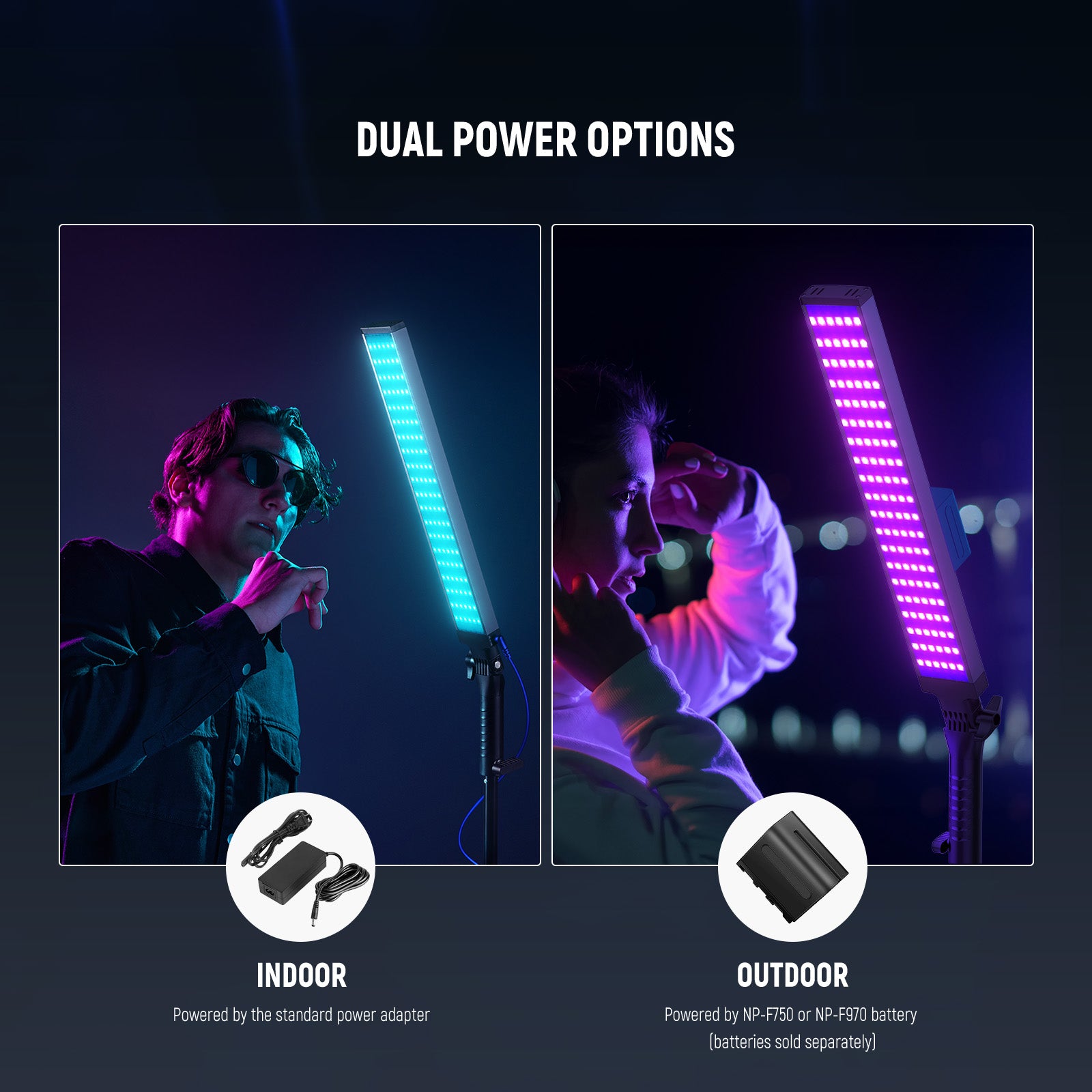 - Dual Power Options via Adapter/NP-F Battery- The included power adapters and cables provide a reliable solution for extended indoor shooting by connecting to power sockets. For outdoor shoots, you can power these LED tube lights with NP-F750 or NP-F970 batteries (sold separately), bringing greater flexibility and eliminating the hassle of cables