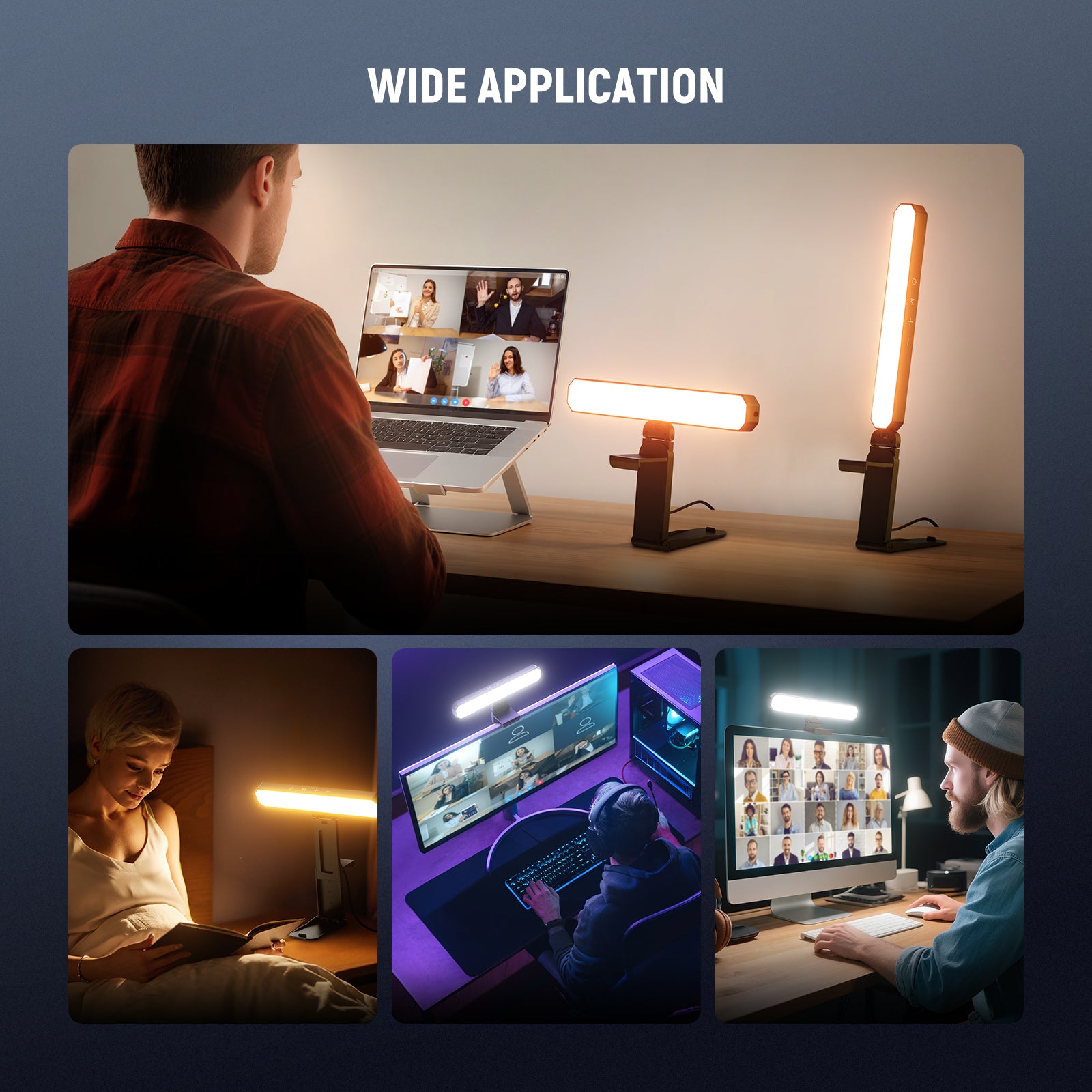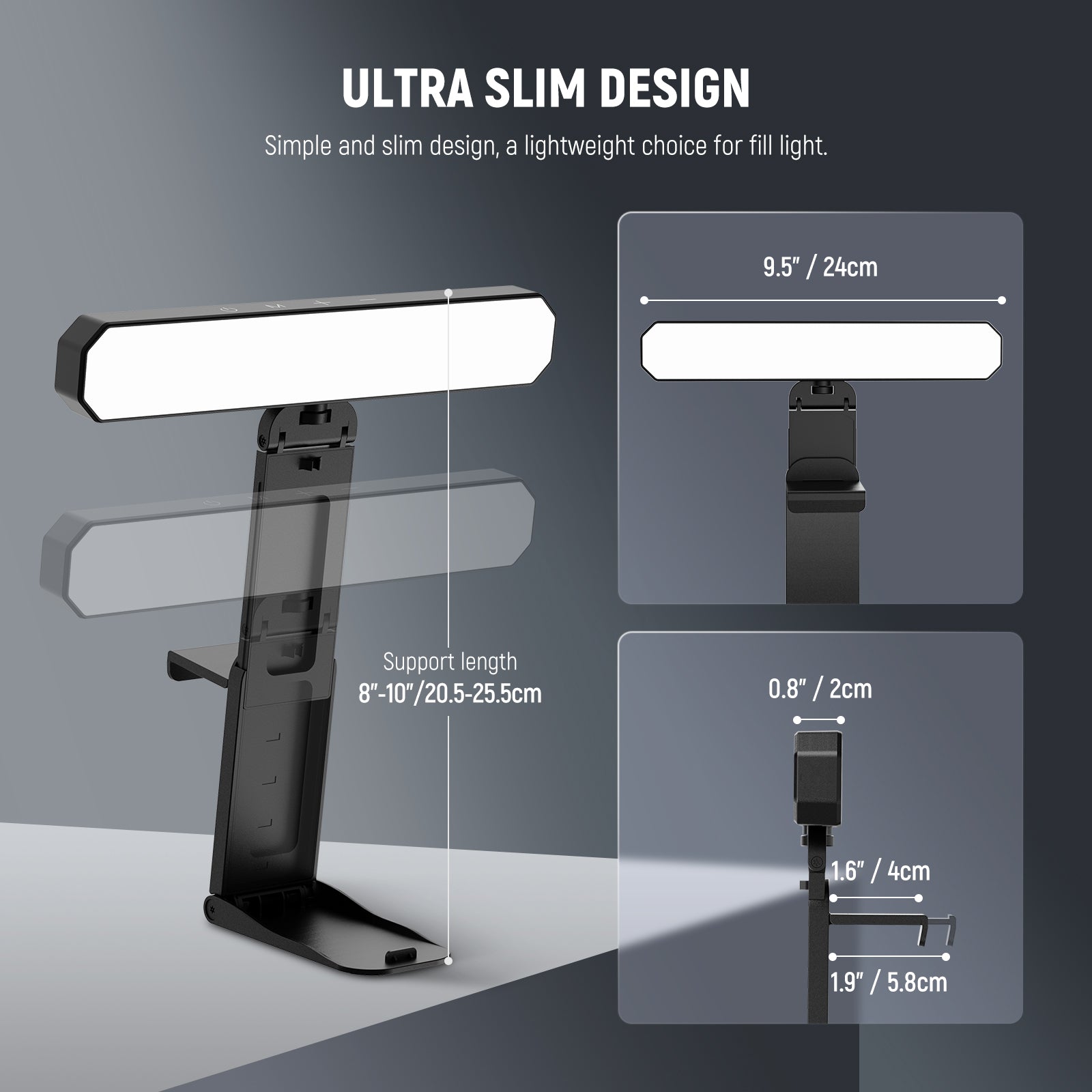 - Flexible Use- The LED desktop panel light with 7.9"-11" stand for phone can be attached vertically and horizontally and tilts 180°. Includes clamps to clip the lights on desk computer, monitor, laptop, webcam, delivering soft lighting for Zoom calls, video conferencing, podcast, gaming, and more