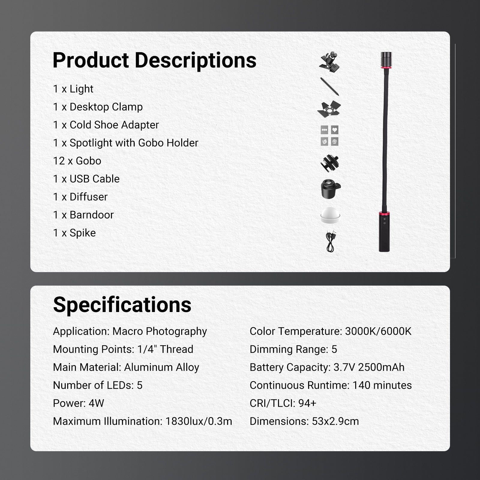 - Macro Photography Lighting- This 4W LED continuous lighting is a content creator essential and influencer must have for macro photography. It features CRI 95, TLCI 94, 1830lux/0.3m max illuminance, 5 colors (red, green, blue, 2700K warm white, 5600K cool white), and 5 brightness levels