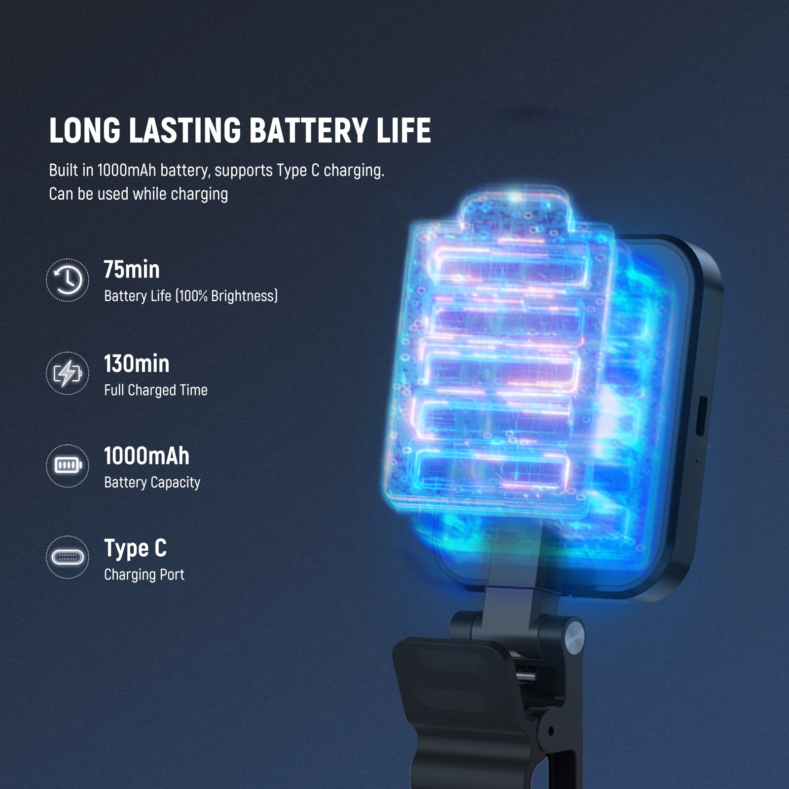 - 75min Long Runtime & Quick Charging- The 1000mAh rechargeable battery enables the LED light to operate for 75 minutes at 100% brightness. A full recharge takes only 130 minutes through a portable charger or laptop using the included USB Type C cable. The fill light can be used while charging, ensuring your shooting process is uninterrupted. NOTE: Please fully charge the device before first use. If not used for a long time, ensure it is completely charged to maintain battery performance with a 5V/2A charger