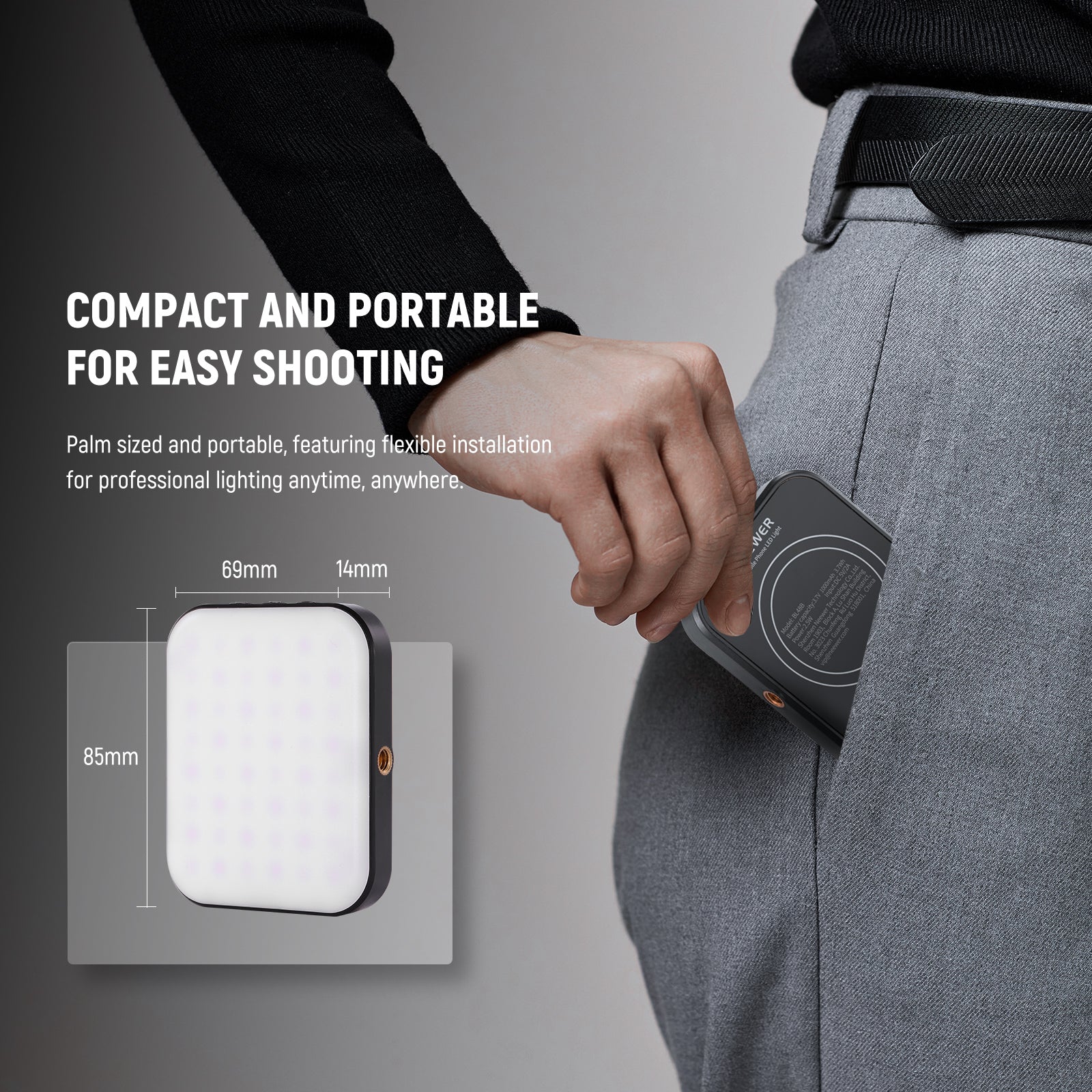 - Portable Mini Selfie Light for Outdoor Shooting- This portable LED fill light for phone photography measures just 3.34"x2.72"x0.55" (85x69x14mm), compact and lightweight, not weighing you down when attached to your phone. It easily slips into your pocket for effortless transport, making a helpful companion for capturing moments and recording videos anywhere you need fill lighting