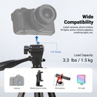 - Metal Build Travel Tripod- Made of heavy duty aluminum alloy, the lightweight tripod with phone holder attachment securely mounts a DSLR (compatible with Canon Sony Nikon cameras), action camera (adapter not included) or smartphone up to 3.3lb/1.5kg for selfies, vlogging creation, live streaming, filmmaking, etc. At 1.25lb/568g, the portable tripod folds down to 16.9"/43cm, with the included carrying bag for photography on the go. The mid spreader helps with instant setup and ensures stability