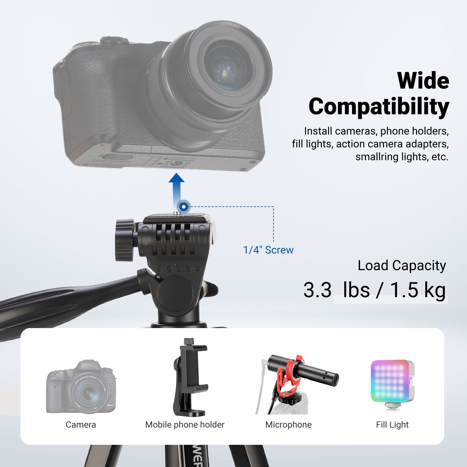 - For Phone & Camera- Attach the phone mount to the tall tripod via the 1/4" screw, 2.2"/55mm to 3.4"/85mm adjustable and compatible with iPhone 17 16e 16 15 Pro Max Plus i Phone 14 13 Samsung Galaxy S24 S23 Ultra Google Pixel 9 8 7 Pro android, with a cold shoe mount for LED fill lights, microphones, etc. Alternatively mount action cameras or mirrorless cameras on the tri pod QR plate, as content creator essential gear and influencer must have photography videography accessories for more versatile use
