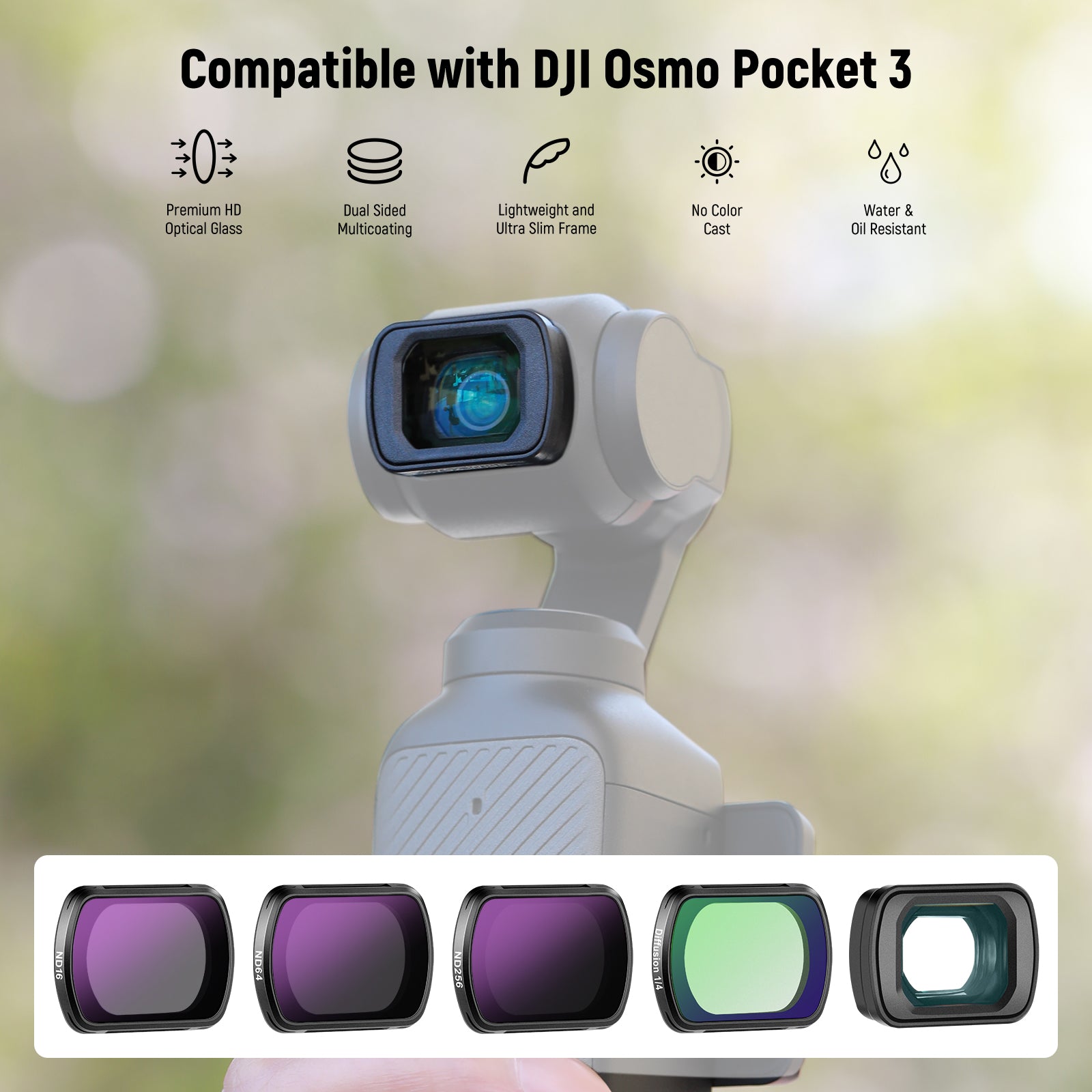 - Compatible with DJI Osmo Pocket 3- This filter and lens accessories kit is designed for Osmo Pocket 3 Gimbal Camera gear. It offers three neutral density filters (ND16, ND64, ND256), a black diffusion 1/4 filter, and a 0.75X wide angle lens to enhance your gimbal photography and action packed video recording as content creator essential and influencer must have. Two tempered glass screen protectors shield the touchscreen and maintain its sensitivity
