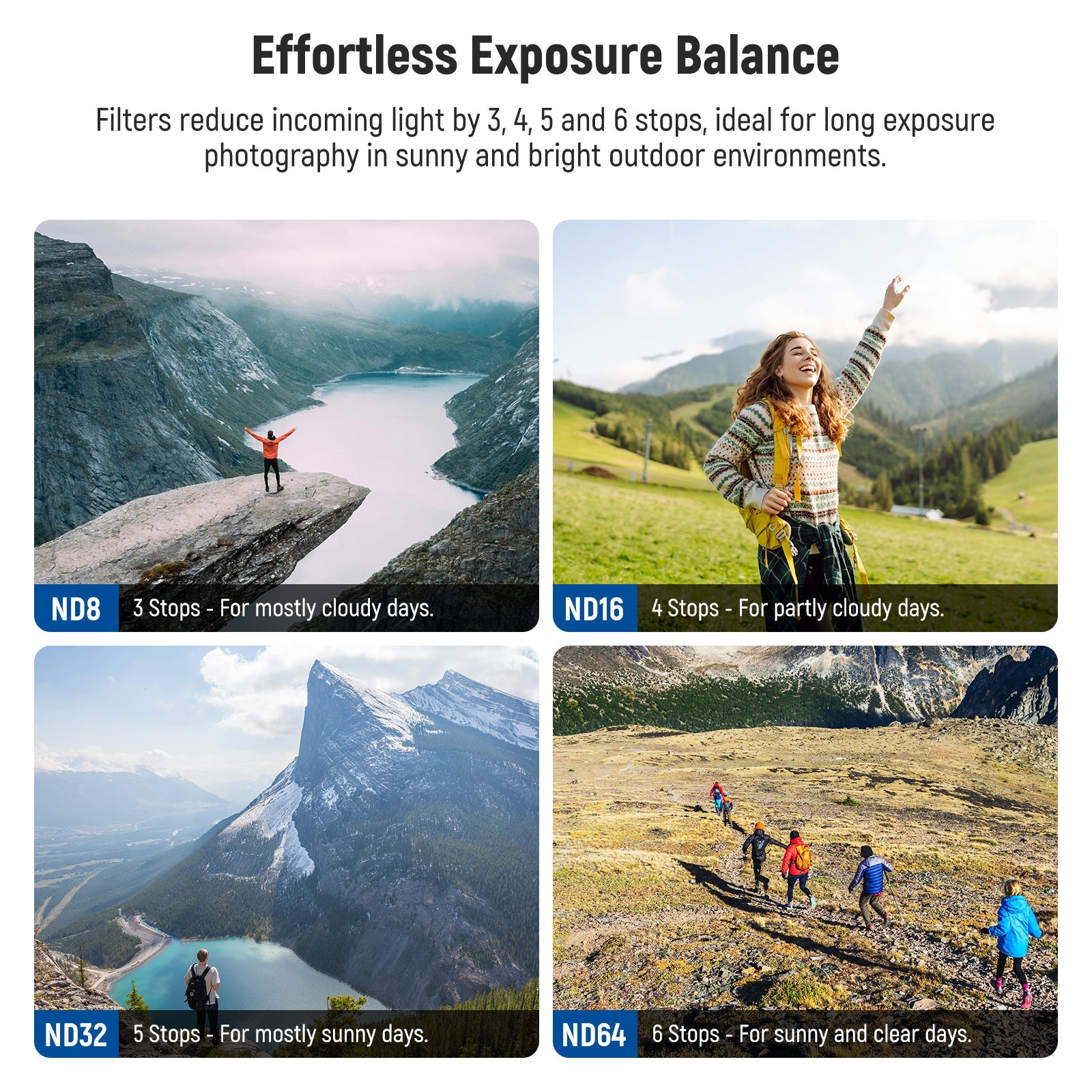 - Effortless Exposure Balance- ND8, ND16, ND32, and ND64 filters reduce the light by 3, 4, 5, and 6 stops respectively, suitable for long exposure photography in bright outdoor conditions. They allow you to shoot at slower shutter speeds with larger apertures and capture movements with expressive motion blur effects