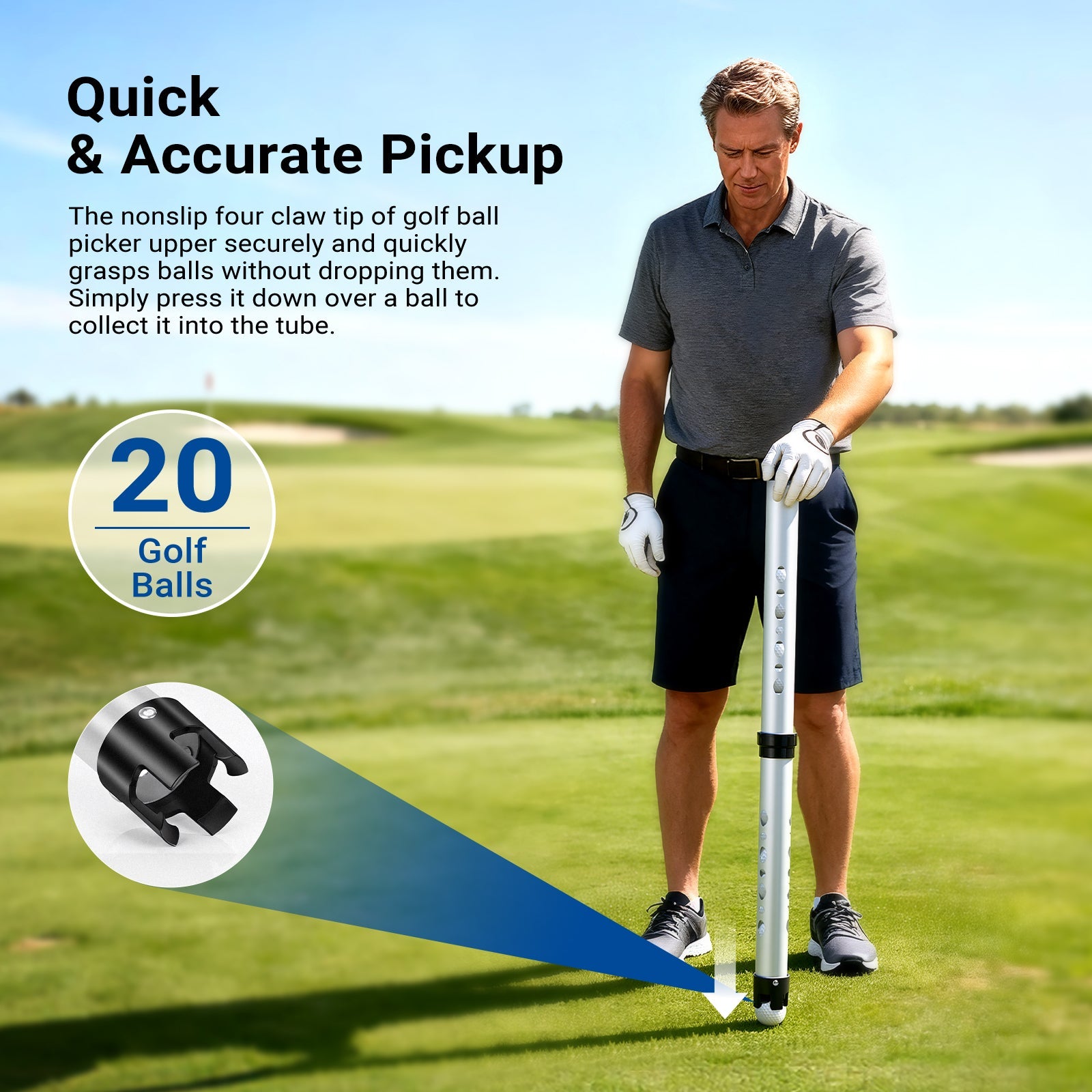 • Quick & Accurate Pickup- The nonslip plastic four claw tip of golf ball picker upper securely and quickly grasps balls without dropping or scratching them. Simply press it down over a ball to collect it into the tube