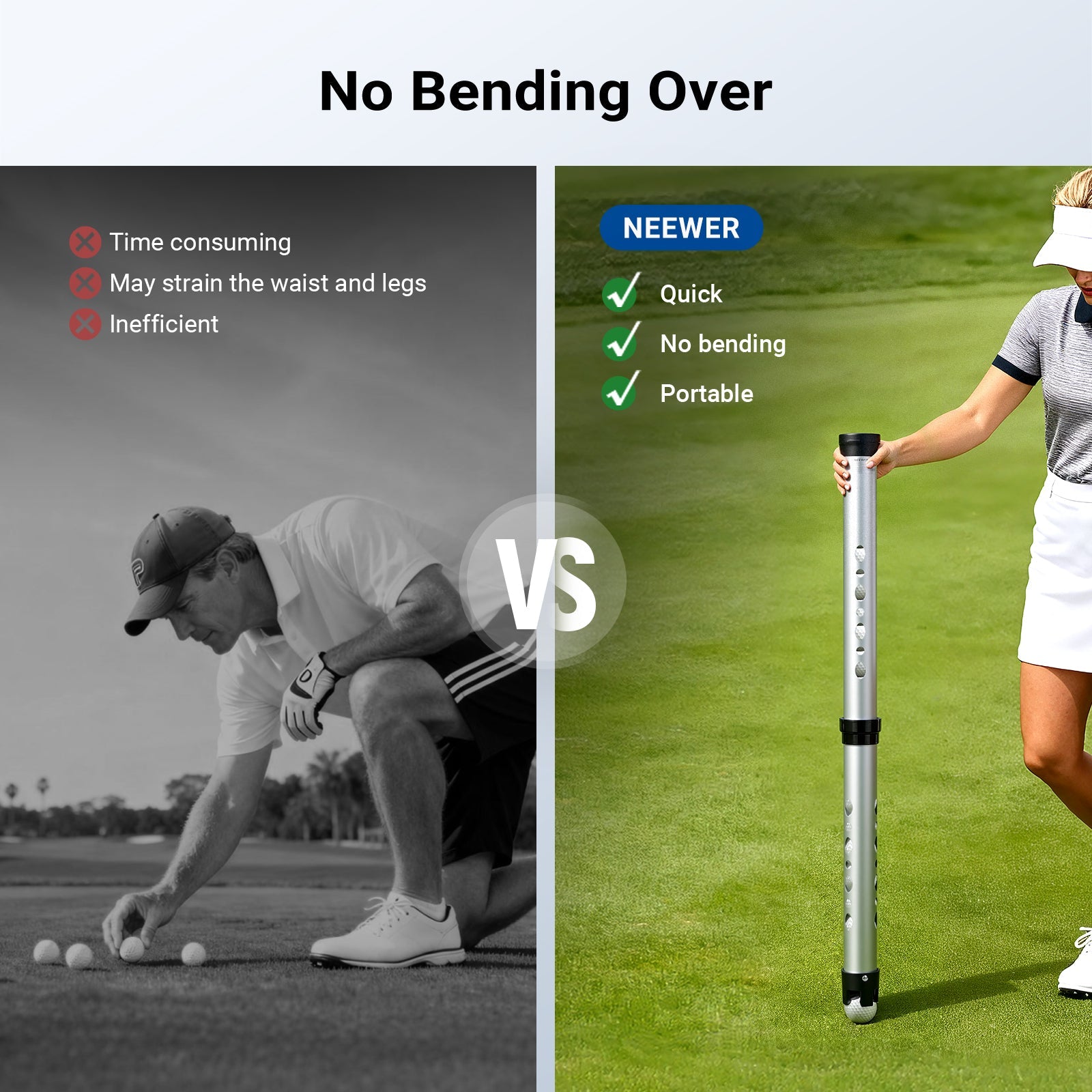 • No Bending Over- This 2 section, 33" golf ball retriever lets you pick up balls without bending, reducing back strain. Its threaded design allows easy & quick assembly