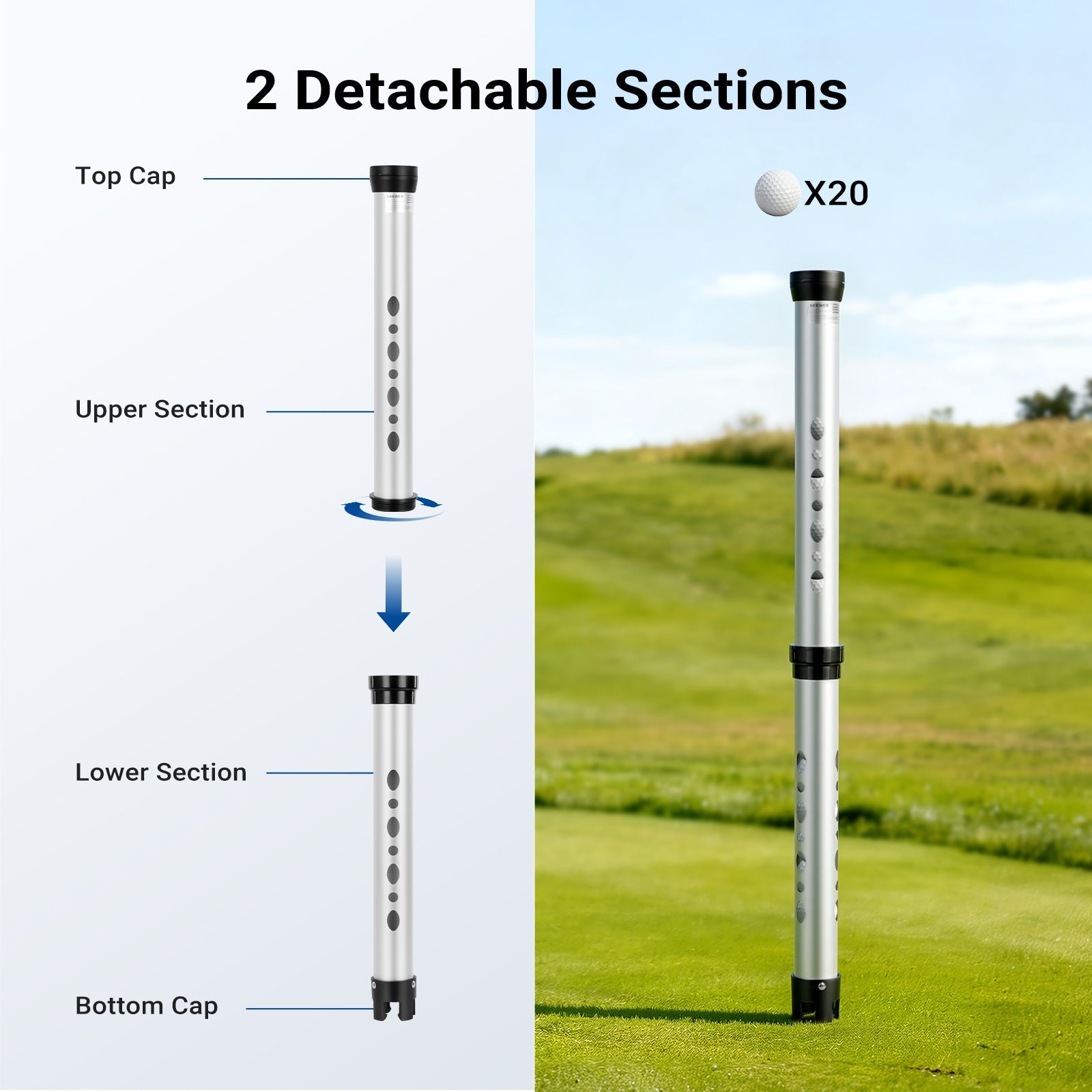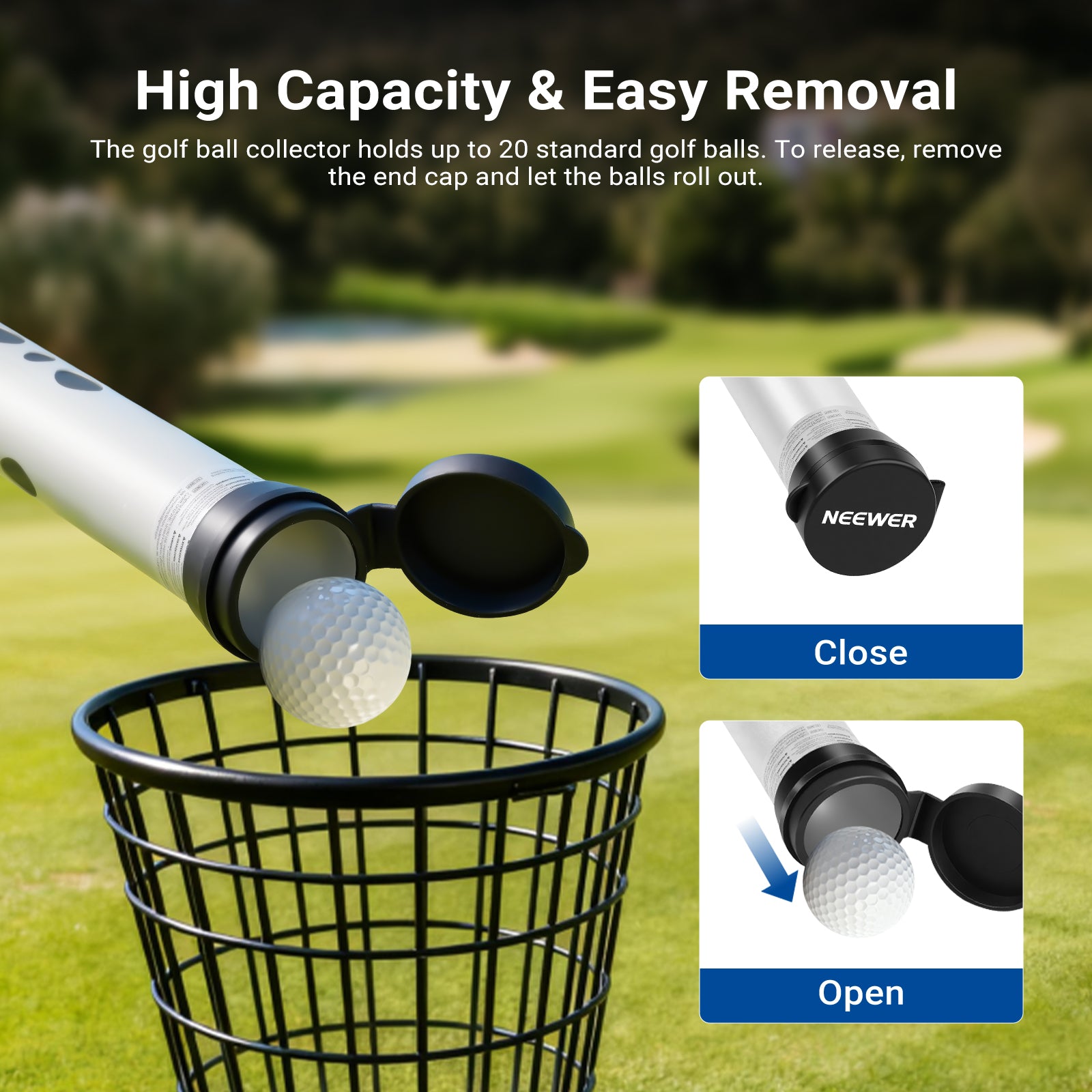 • High Capacity& Easy Removal- The golf ball collector holds up to 20 standard golf balls, ideal for on course golf training accessories & practice for men & women. To release, remove the end cap and let the balls roll out