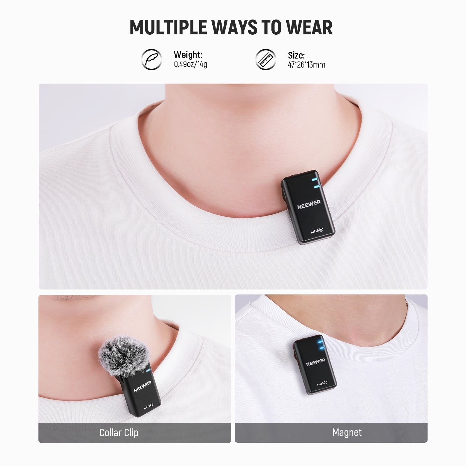 - High Fidelity Audio- Each transmitter is equipped with an omnidirectional condenser mic, capable of correcting vocal curves and picking up voices 360° for HD uncompressed audio quality. Each TX has a 3.5mm audio jack for connecting the wired microphone such as NEEWER CM5, ensuring professional audio requirements in various scenes. RX enables real time monitoring and phone charging via its type C interface, and volume control by the adjustment button
