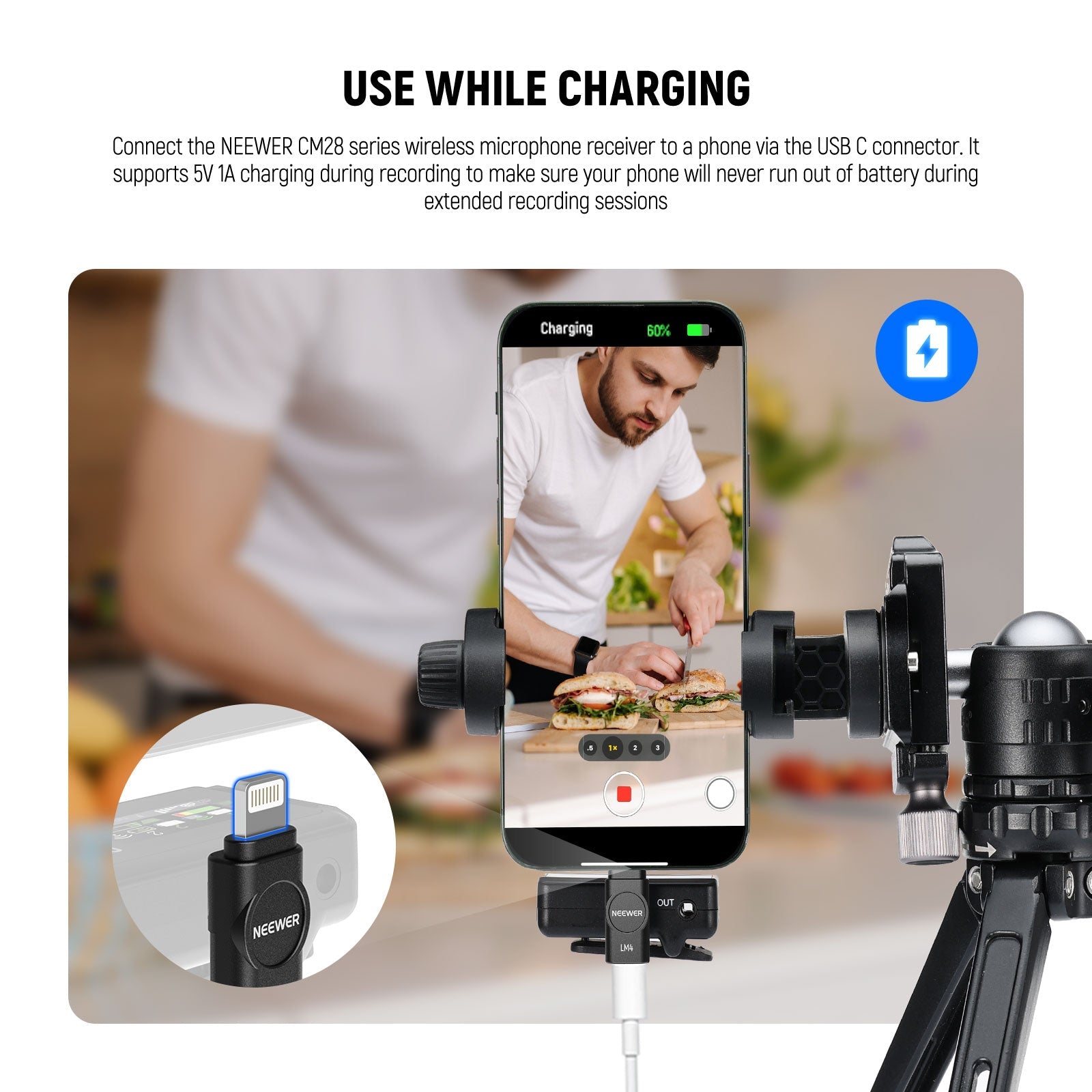 - How to Use- Connect the NEEWER CM28 series wireless microphone receiver to a phone via the USB C connector. It supports 5V 1A charging during recording to make sure your phone will never run out of battery during extended recording sessions