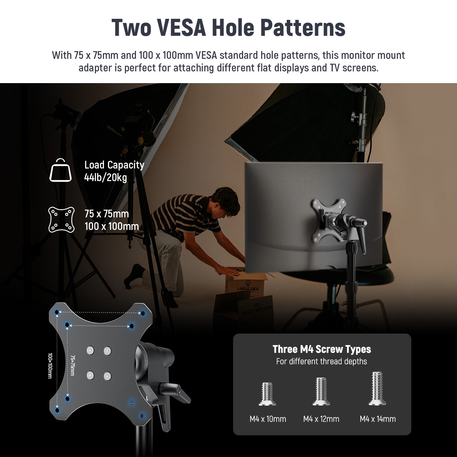 - Standard VESA Monitor Mount- With 75 x 75mm and 100 x 100mm VESA standard hole patterns, this monitor mount adapter is perfect for attaching flat displays, TV screens, and field monitors up to 44lb/20kg