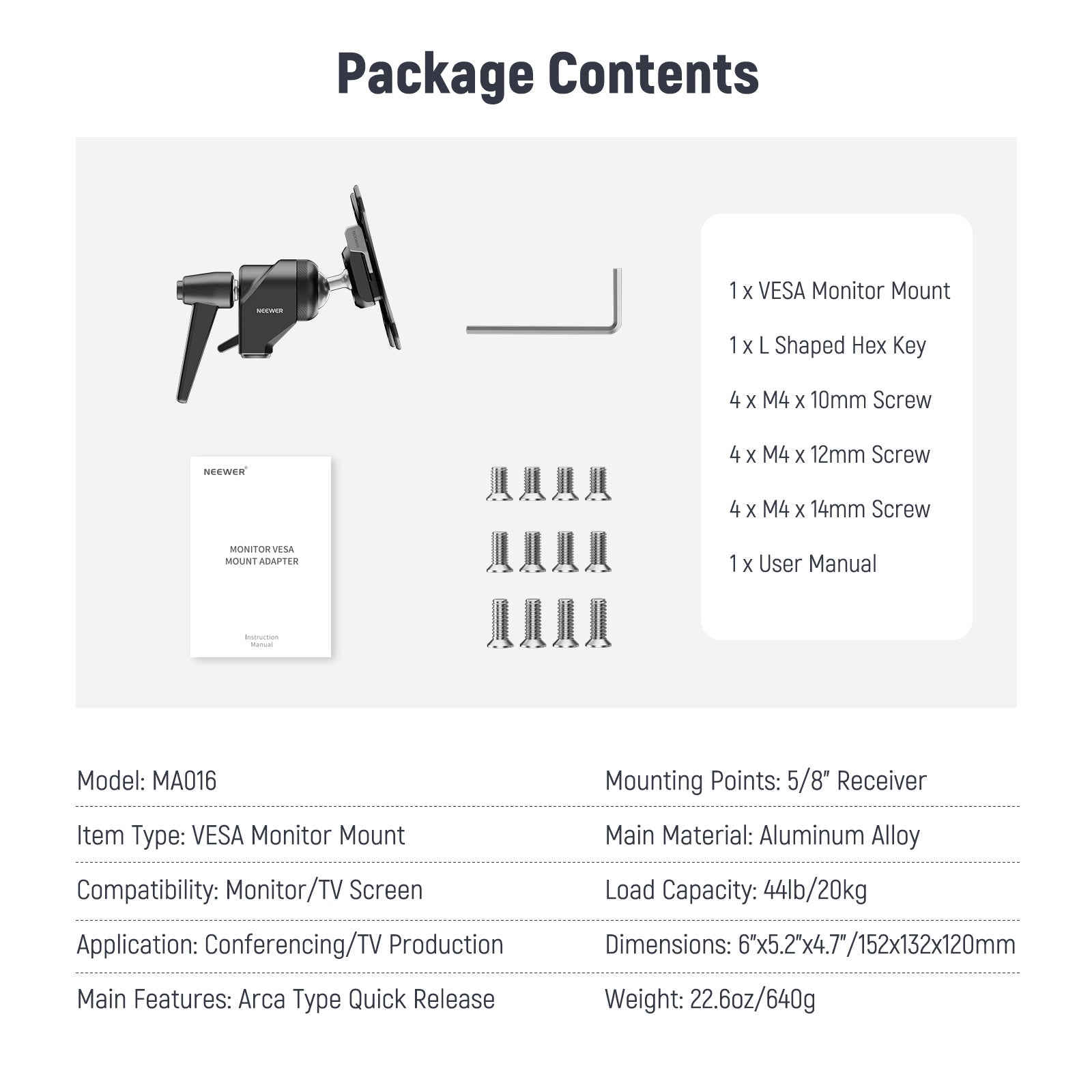 - Arca Type Quick Release Clamp- Compatible with the Arca type quick release mounting system, this VESA mount allows you to install, fasten, release, and remove the screen with ease
