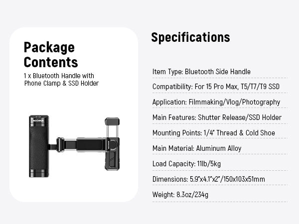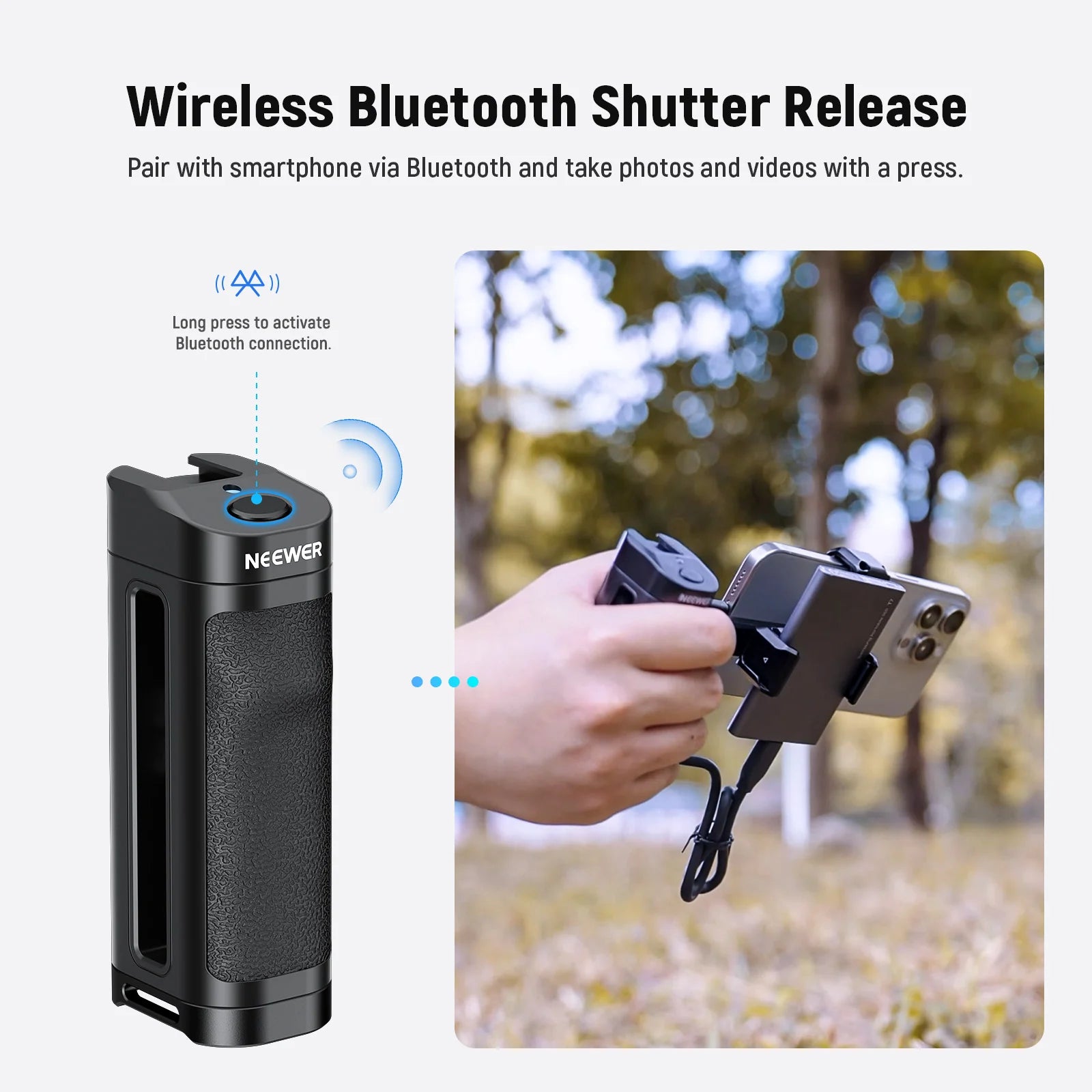 - Side Handle with Bluetooth Shutter- This side handle grip with a Bluetooth model can connect to your iOS/Android phone via Bluetooth and lets you take photos and videos with the press of the shutter release button. Perfect for filmmaking, YouTube/TikTok vlogging, live streaming, selfies, and other creations