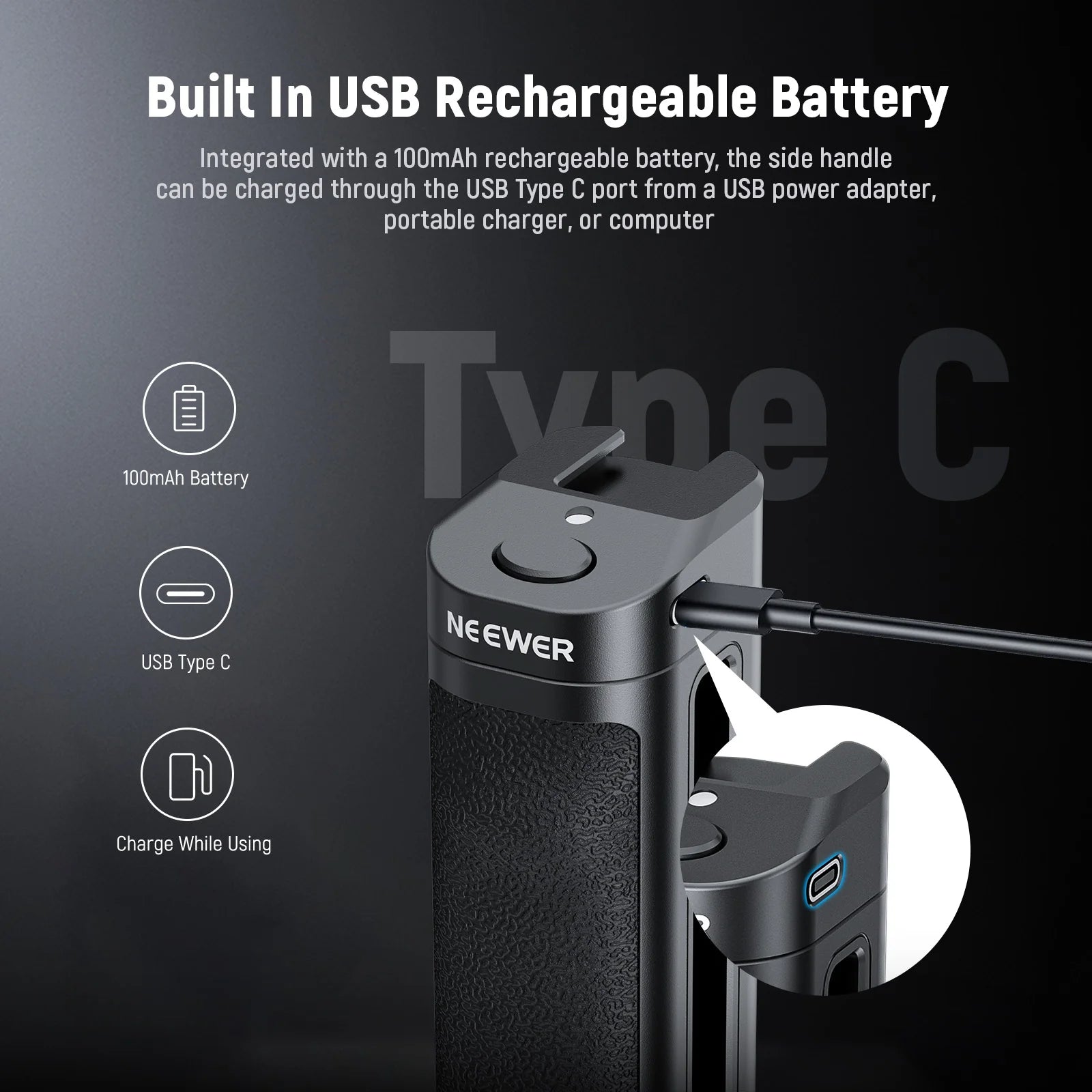 - Built In USB Rechargeable Battery- Integrated with a 100mAh rechargeable battery, the wireless Bluetooth shutter release side handle can be charged through the USB Type C port from a USB power adapter, portable charger, or computer
