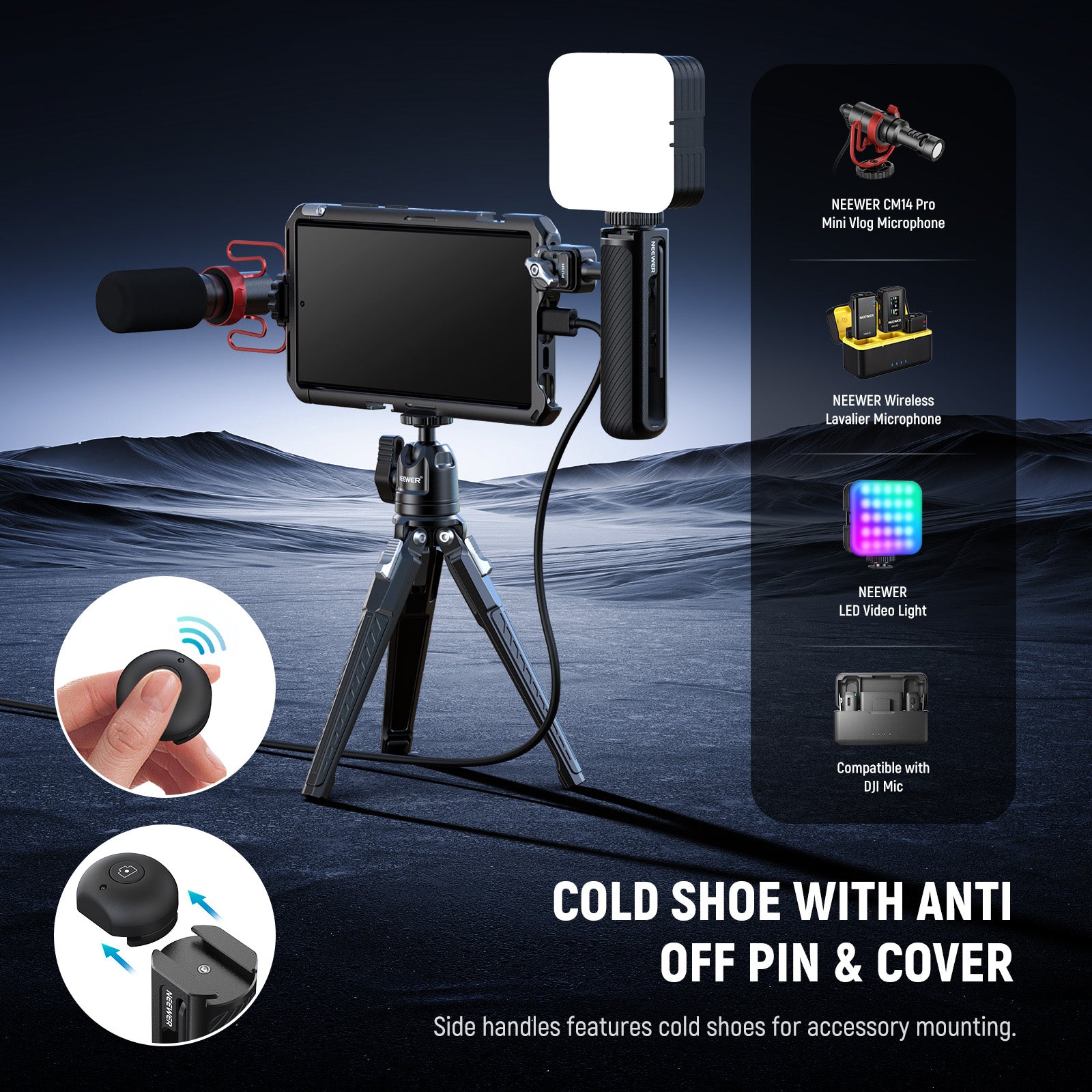 • Multiple Accessory Mounting Points- With 1/4" threads and cold shoe mounts, this cage can connect to PA045 Quick Release Side Handle, PA026 Dual Side Handles, PS005E Side Handle with Bluetooth Wireless Shutter Button, PL81 Mini LED Video Light, RGB61/RGB62 RGB Light, CM22/CM28 Wireless Lavalier Microphone System, CM14 Pro Mini Vlog Microphone, CA070 Weight Reducing Shoulder Strap, T30 Flexible Tripod, T29/T31 Tabletop Mini Tripod, TP15 Carbon Fiber Travel Tripod, and more