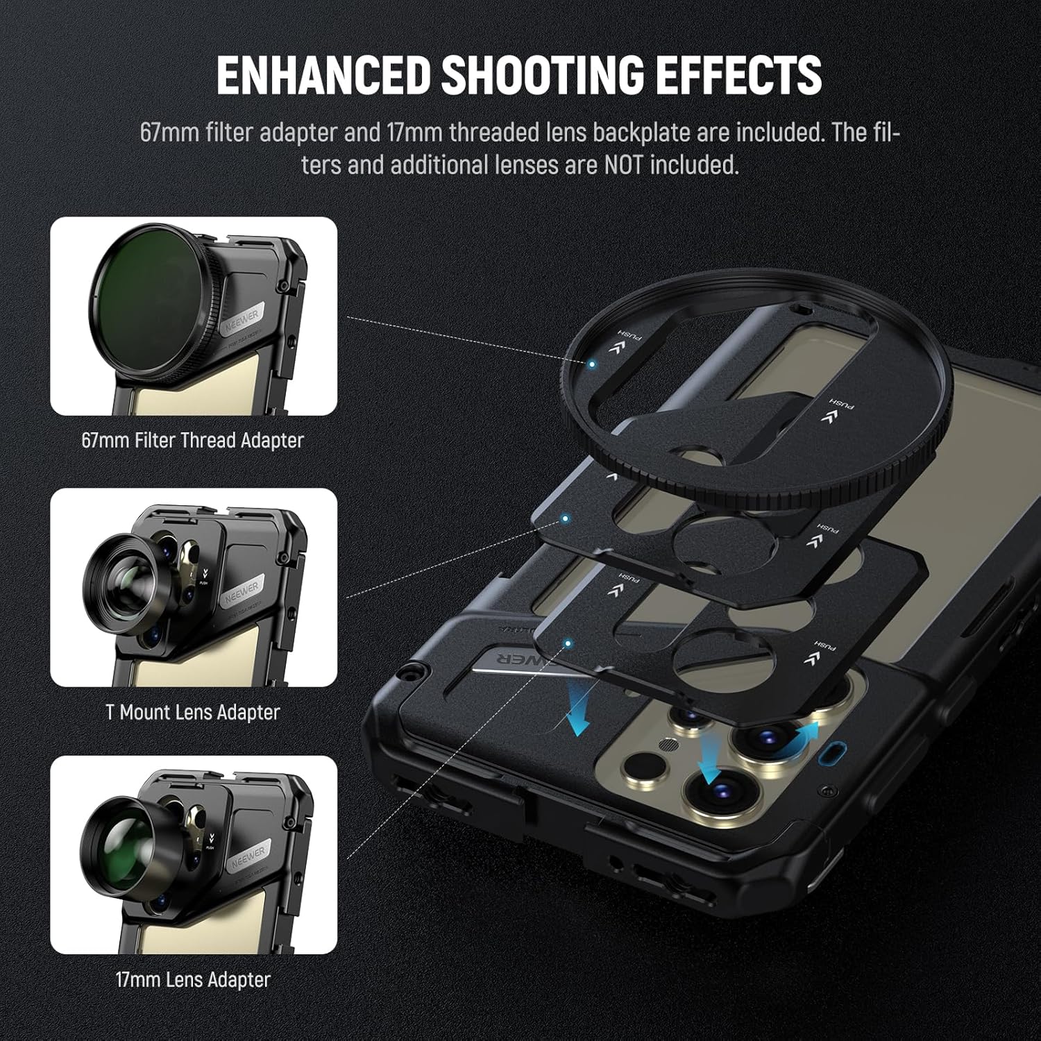 • 17mm Threaded Lens Backplate- The 17mm threaded lens backplate mounts 105mm macro, 10x macro, 8mm fisheye, 45x microscope with LED light, 7x telephoto, 60mm telephoto, 18mm wide angle, 1.55x blue anamorphic, and other NEEWER phone attachment lenses with 17mm threads (lenses sold separately). Note: 1. Please disable focus enhancer. 2. If vignetting occurs, zoom the camera out to 1.1x or more