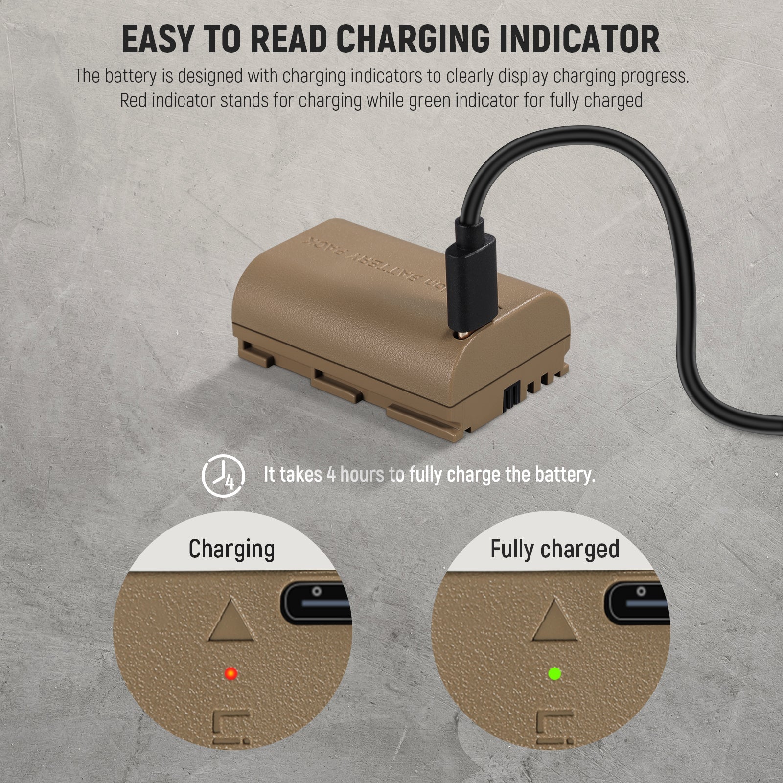 - USB Type C Charging Port- The featured USB Type C charging interface makes it much easier to charge your camera battery on the go. With the included USB Type A to Type C charging cable, quickly charge the battery by connecting to a portable charger or wall charger. Also compatible with the original LP-E6NH battery charger