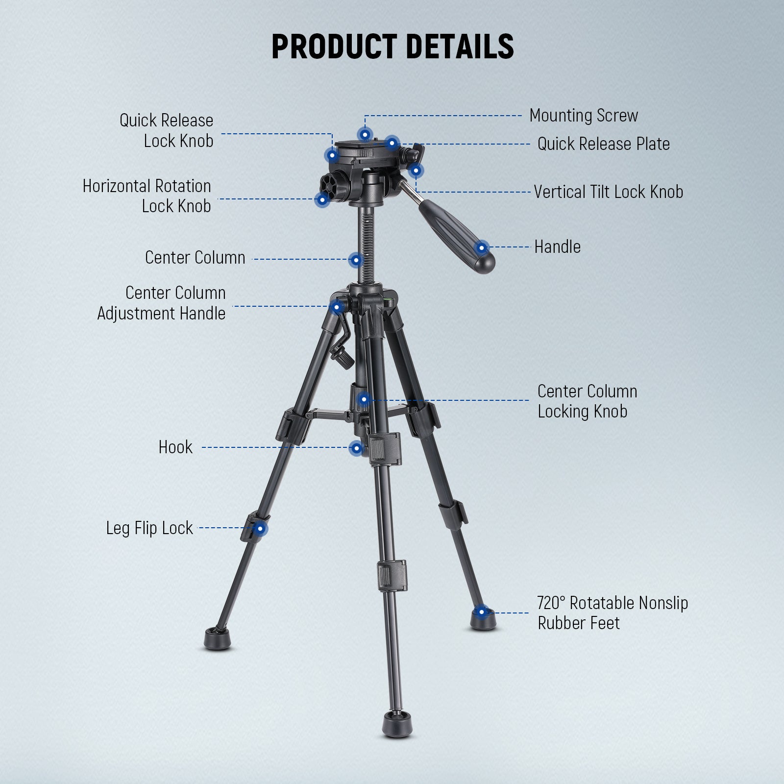 - 3 Way Pan Tilt Head & Built in Handle- With a 3 way pan tilt head, you can effortlessly achieve seamless transitions from horizontal to vertical compositions. The built in handle and bubble level ensure quick and easy adjustments, while the 720° rotatable nonslip rubber feet provide stability on any terrain