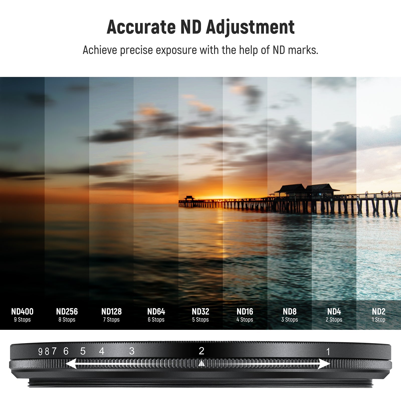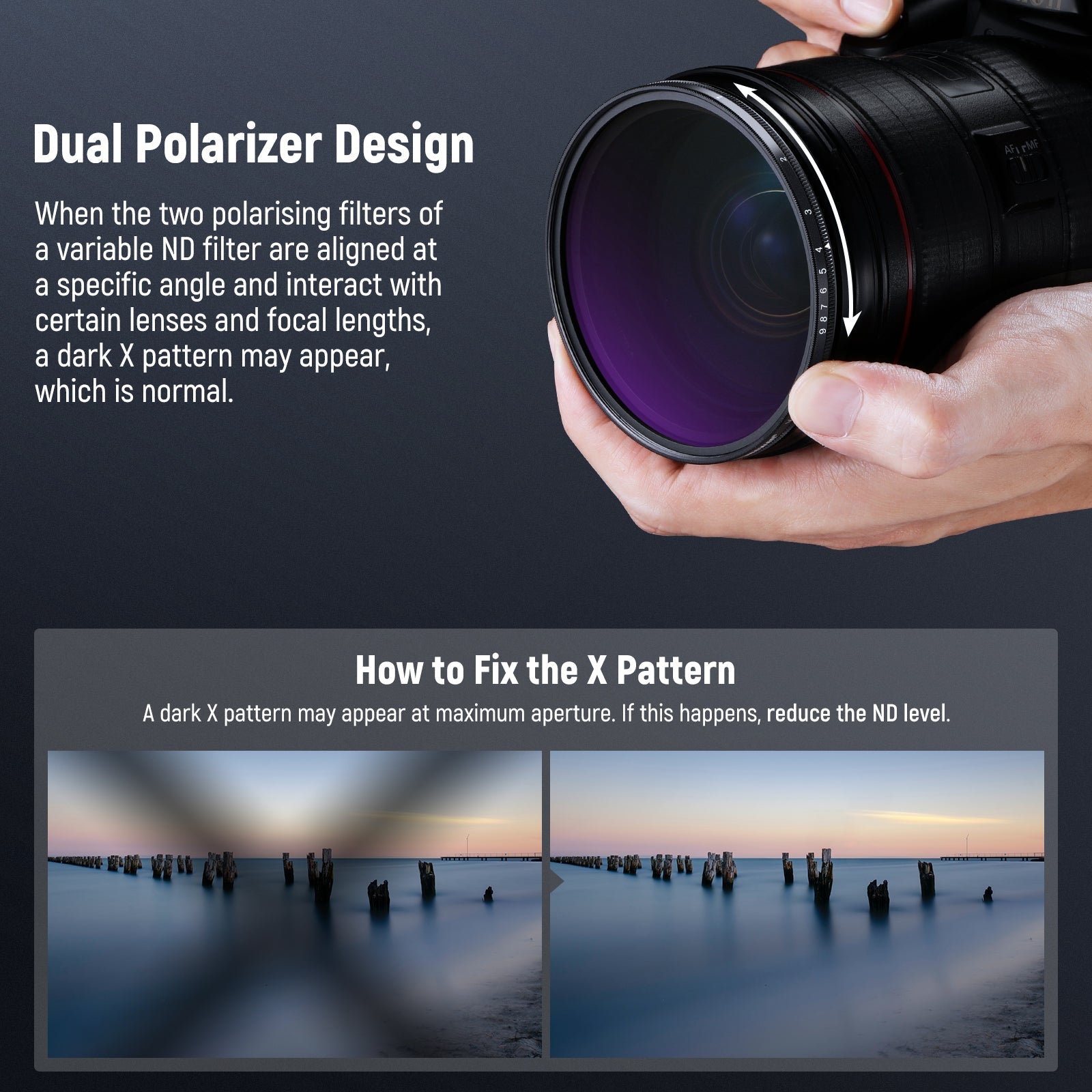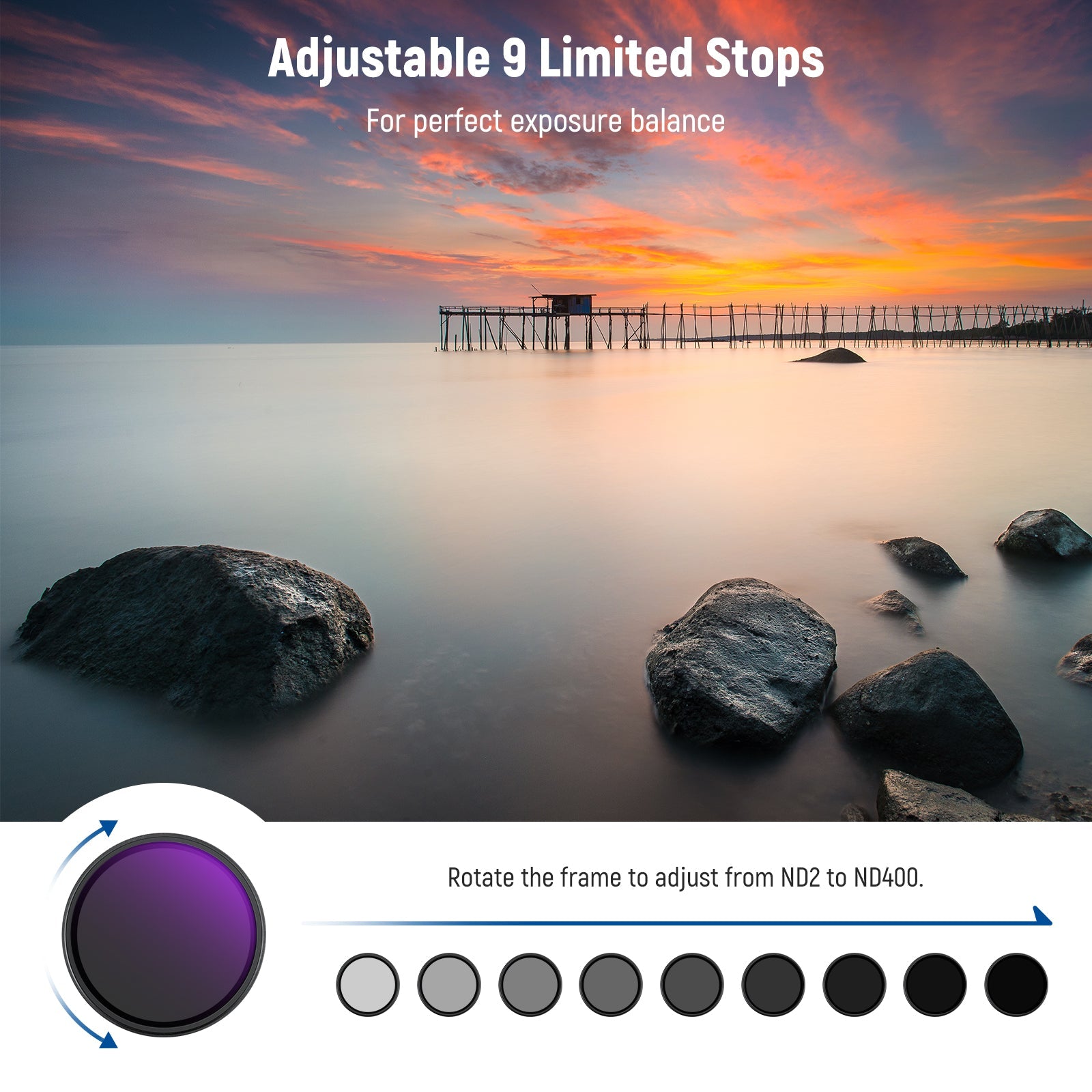 - Flexible Exposure Control- This variable ND2-400 filter offers limited 1-9 stops of light reduction. Rotate it to precise stops for desired ND values and perfectly exposed pictures. Note: A dark X pattern may appear at maximum aperture. This normal phenomenon occurs when the variable ND filter, with its two polarizing filters aligned at a specific angle, interacts with certain lenses and focal lengths