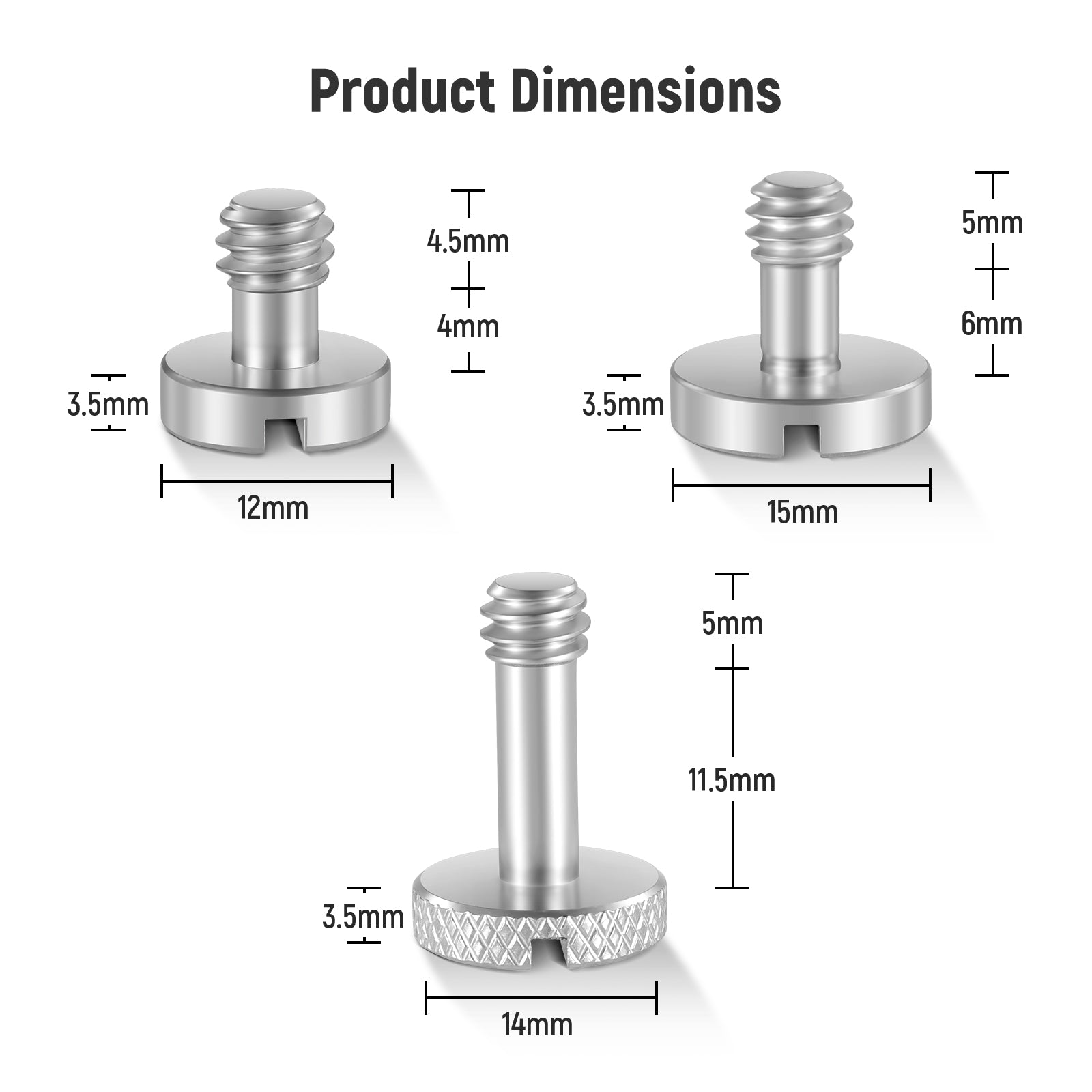 - Quick Release Replacement Screw- Securely mount your camera on the quick-release plate with the 1/4'' slotted screw kit. The 1/4" screws in 3 different sizes with 5 pcs each including 16.5mm (5mm threaded, 11.5mm unthreaded), 11mm (5mm threaded, 6mm unthreaded), and 8.5mm (4.5mm threaded, 5mm unthreaded), for any size and extra quantity for your quick release needs